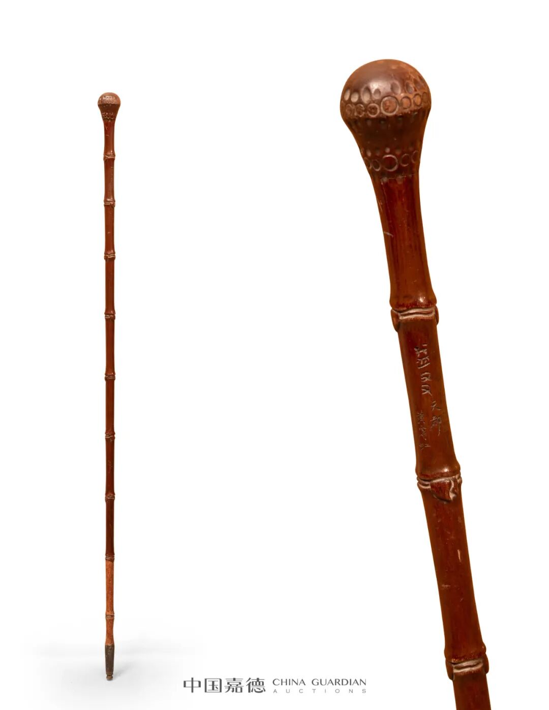 木质文明杖,杖身竹节纹,挺拔清俊,杖首蘑菇形,木瘤团簇,圆润适手,古朴自然。杖底宝珠足,整体包铜,结实耐用,防损防朽。