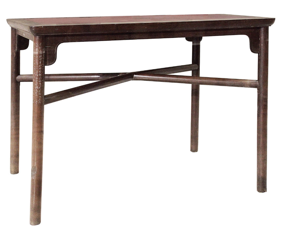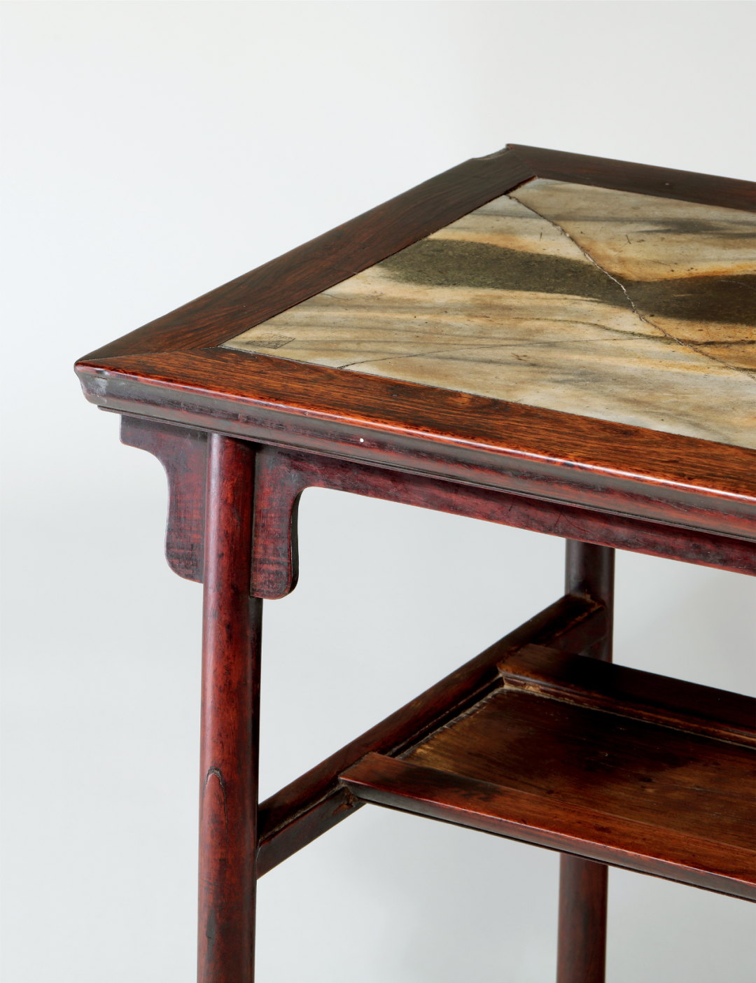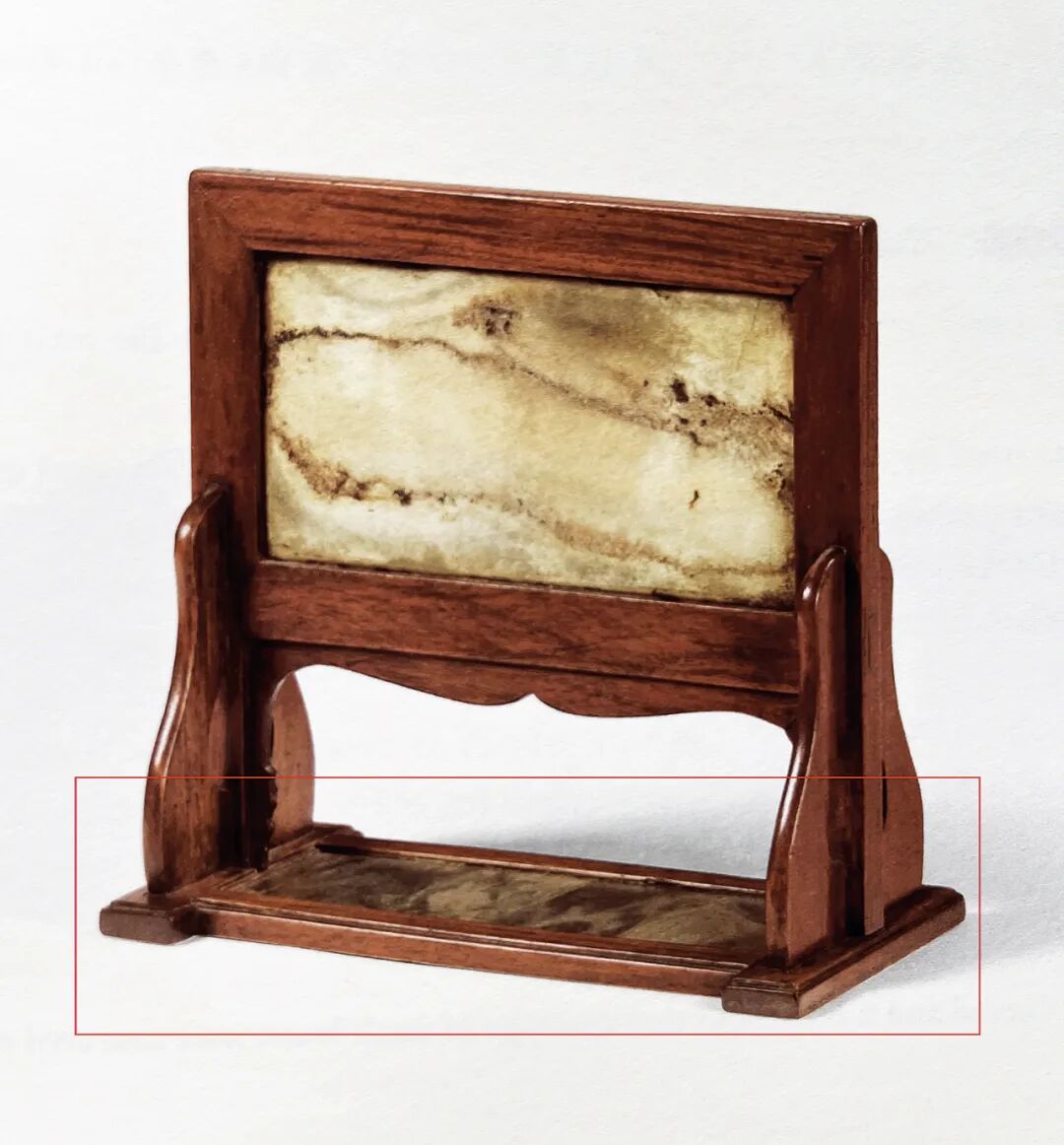 勾挂垫榫,采用的是一种燕尾榫结构的原理,是将腿足的卯右雕凿为里大口小、上斜下平的半燕尾形,相应的枨子榫头则做成窄几毫米的半燕尾形,直插入卯口向燕尾一侧上推,然后在下方另加垫榫填补空隙,则榫头与垫榫组合成一个里大外小的榫卯,枨子得以牢牢勾挂住腿足,稳固异常。拆卸时凿去垫榫,推下榫头,方可拔出枨子。勾挂垫榫常用于霸王枨结构、条案的梯子枨下枨,少量见于椅子的赶枨。所谓“墨林棐几”的黄花梨红漆面十字枨小画桌,其十字枨下方亦采用勾挂垫榫结构,或可见明代嘉兴匠人对这种榫卯的习惯性应用。此几的勾挂垫榫,则是采用上方加垫榫做法,甚为别致。大理石以产云南大理点苍山而得名,又名点苍石、云石,黑质白章,纹路如山峦、云气,和米家山水意境最合,是制作屏风、桌面的上好材料。明代徐霞客曾叹曰:“故知造物之愈出愈奇,从此丹青一家,皆为俗笔,而画苑可废矣。”纹如山水烟云令“画苑可废”,的大理石被用作制器较晚,约略在明初,如景泰六年成书的《景泰云南图经志书》中已出现点苍石,但暂未发现更早证据或迹象。在爱石如痴的宋代时默默深藏西南山川,令虢州石占尽风流,然而自明景泰一经发现,便受到皇宫大内、官宦、文士的追捧,极受青睐,货赛珍宝。明陆深《大理石屏铭》:“远岫含云,平林过雨,一屏盈尺,中有万里。”明李日华《大理石屏所现云山》:“晴则寻常,雨则鲜活,层层显露,物之至者未尝不与阴阳通,不徒作清士耳目之玩而已。”明黄训《名臣经济录》卷二十二载,明正徳中,籍没太监刘瑾家产,有大理石屏风三十三座。明孙承泽《春明梦余录》载奉天殿正殿“嘉靖四十一年改名皇极殿,制九间中为宝座,座旁列镇器,座前为帘,帘以铜为丝,黄绳系之,帘下为毡,毡尽处设乐殿,两壁列大龙橱八,相传中贮三代鼎彝,橱上皆大理石屏。”明嘉靖时“乾清、坤宁二宫告成,需石陈设,滇中以石四十椟分制佳名以进。内有山水人物屏石八块,曰山川出云,烟波春晓,白雪春融,云龙出海,槎泛斗牛,春云出谷,海晏河清,振衣千仞。”今故宫宁寿门和景仁门当门各设一大理石心汉白玉框、座落地大石屏,均为明物,或即当时所遗。《金瓶梅》记应伯爵劝西门庆当的一架大螺钿大理石屏风和两架铜锣铜鼓连铛儿,值30两银,大理石屏风“三尺阔、五尺高,可桌放的螺钿描金大理石屏风,端的是一样黑白分明”。应伯爵夸赞“恰相好似蹲着个镇宅狮子一般”。“西门庆把屏风扶抹干净,安在大厅正面,左右看视,金碧彩霞交辉”。一个强取豪夺,一个帮腔做事,“与阴阳通,不徒作清士耳目之玩”的大理石“徒作”了富贵的门面。大理石需人工凿取,既耗民力,又颇危险,驻地官宦又驱使军匠,贪婪挖掘,劳民伤财,故云南当政者多见其弊,奏疏请罢采办之事。《滇志》载正德时云南巡抚陈察奏请封闭。《养吉斋丛录》载:“明正德间镇守中官遣军匠攻凿,山崩压死无算,巡抚欧阳重疏罢之,见重传。”《滇志》录有嘉靖时云南巡抚蒋宗鲁《奏罢屏石疏》,恳请减免采办大理石数目、尺寸,叙采石之难:……据耆民段嘉琏等告称,嘉靖十八九年曾奉勘合取大屏石,难寻崖崄,压伤人众,及至大路行未百里,大半损缺。重复采补,沿途毛弃所解石块,二年外方得到京。至三十七年,取石六块,见方三尺五寸,自本年六月至十一月始运至普淜小孤山,因重,毛弃在彼,且自大理至小孤山止有三百余里,自六月以半年行三百里未免有违钦限,徒劳无功……云南地方僻在万里,舟楫不通,与中州平坦不相同,先年采取三尺石,自苍山至沙桥驿陆运只五程,劳费踰四月,供给不前,所过骚扰军民啼泣……文中或有适当夸张,但取石之难、险,运石之劳费,可见一斑。故明代文士李应桢作送行诗有“相思莫遣石屏赠,留刻南中德政碑”,挥一挥衣袖,不带走一片云彩,透露出对“大理石屏,近年朝绅争尚官其地者,以是劳民伤财”之事的不满。清代时大理石亦受青睐,乾隆皇帝御制诗多有大理石相关者,如《瀛台大理石屏歌》,赞其“直方大幅出岩峦,制为屏风陈座端……白质青文润以腴,高低溪壑天然图,倪黄董臣称妙手,疏皴澹染终不无,廉而弗刿柔岂屈,巍然犹是前朝物,几经海水复桑田,依旧春风更秋月。”今所存清宫旧藏大理石屏虽不多,亦不乏精彩者。清中晚期名臣阮元,道光时任云贵总督,更是爱之成痴,所著《石画记》五卷(其中后两卷为其三子阮祜所作),录石510片(另13片),冠以名录,题刻石上,并撰写描述文字达391篇,数量之巨令人咋舌,今市肆亦见有阮元遗物,不乏佳品,但石之古雅苍劲,似逊于明代石品。与阮元同时代的怀米山房曹载奎蓄石亦丰,有三祝吾庐,壁间所挂无非大理石,山水人物鸟兽虫鱼无不备具。大理石用紫檀镶边,其石画或凑成四条,或横帔单条堂画,无美不备。珍贵的大理石在明代既已价值非凡,《五杂俎》记:“滇中大理石,白黑分明,大者七八尺,作屏风,价有值百余金。”《铁琴铜剑楼藏书题跋集录》载藏书家黄丕烈有一张项元汴大理石画桌,得自陆西屏:西屏善识古,书籍而外,余家向收大理石画桌,亦其家旧藏,伊侄亲为余言,此桌出墨林山堂,石背镌此四字,并镌云:“其直四十金。”自余收得后,吴中豪家喜蓄大理石器具者,皆来议让,卒以未谐而止。岁丁丑大除,晤一博闻往事之人,谈及墨林当日,有数十万金之书画,皆与此桌上展阅,故项氏甚重之,而此石光泽可鉴,盖有无数古