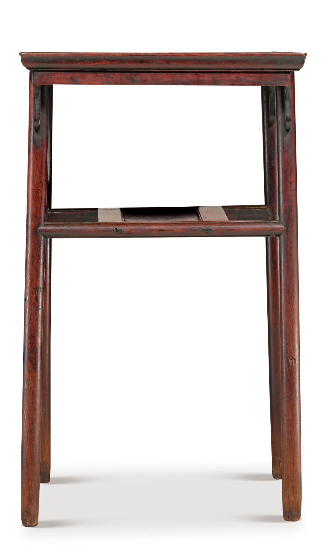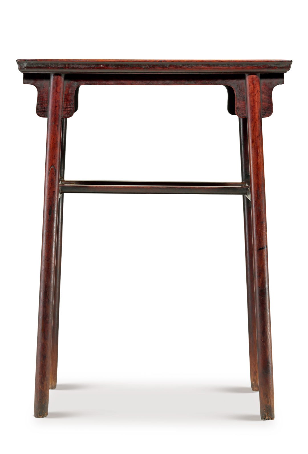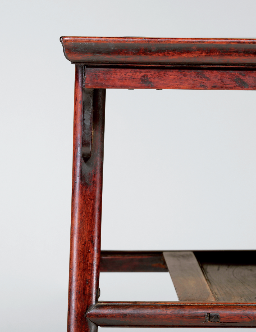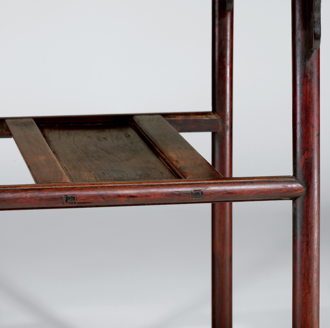 在面下不足尺许,装有“l=l ”形屉板,看面做薄挺的冰盘沿,内缘起委角线,落膛镶板,如一个灵巧的长方窄盘悬空而设,为前所未见之特殊结构。常见屉板做法则为纵、横枨皆交于腿足,屉板与案面宽度相近,此处纵向收窄,除了取其秀巧,与整体空灵造型相契,免得失于笨拙外,亦避免纵、横枨同交于如此纤细的腿足,榫眼过于密集,以影响腿足的坚固。再查榫卯,则见纵枨与腿足相交处用闷榫,上方有小垫榫,显然这是勾挂垫榫做法。全器唯在屉板横枨处做透榫,并加楔加固。观其结构、榫卯,可谓步步为营,处处巧思。![]()