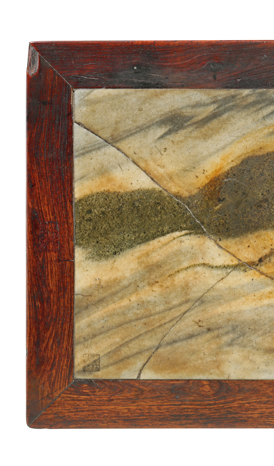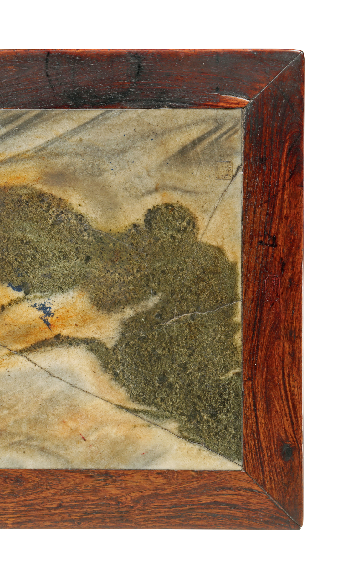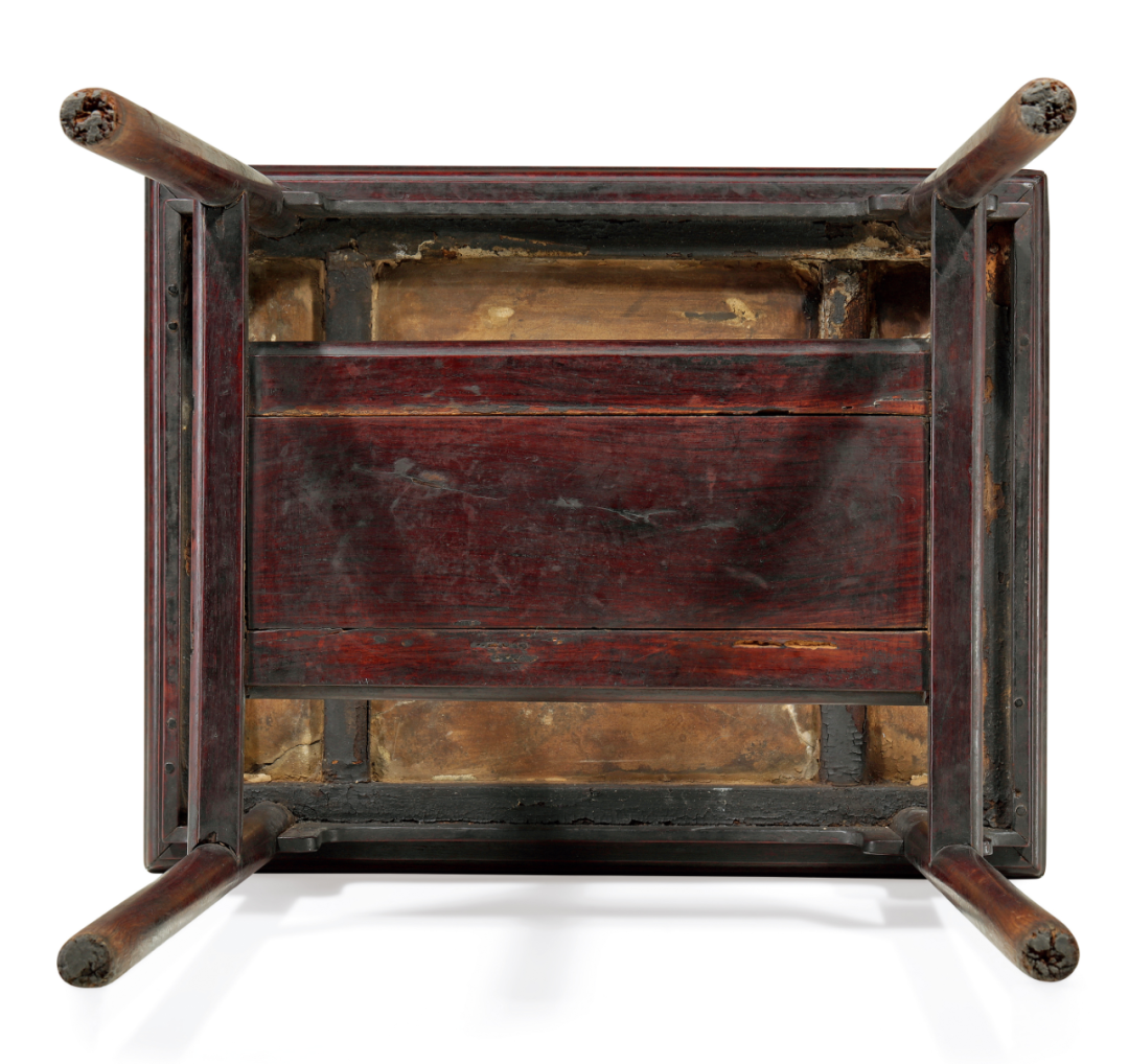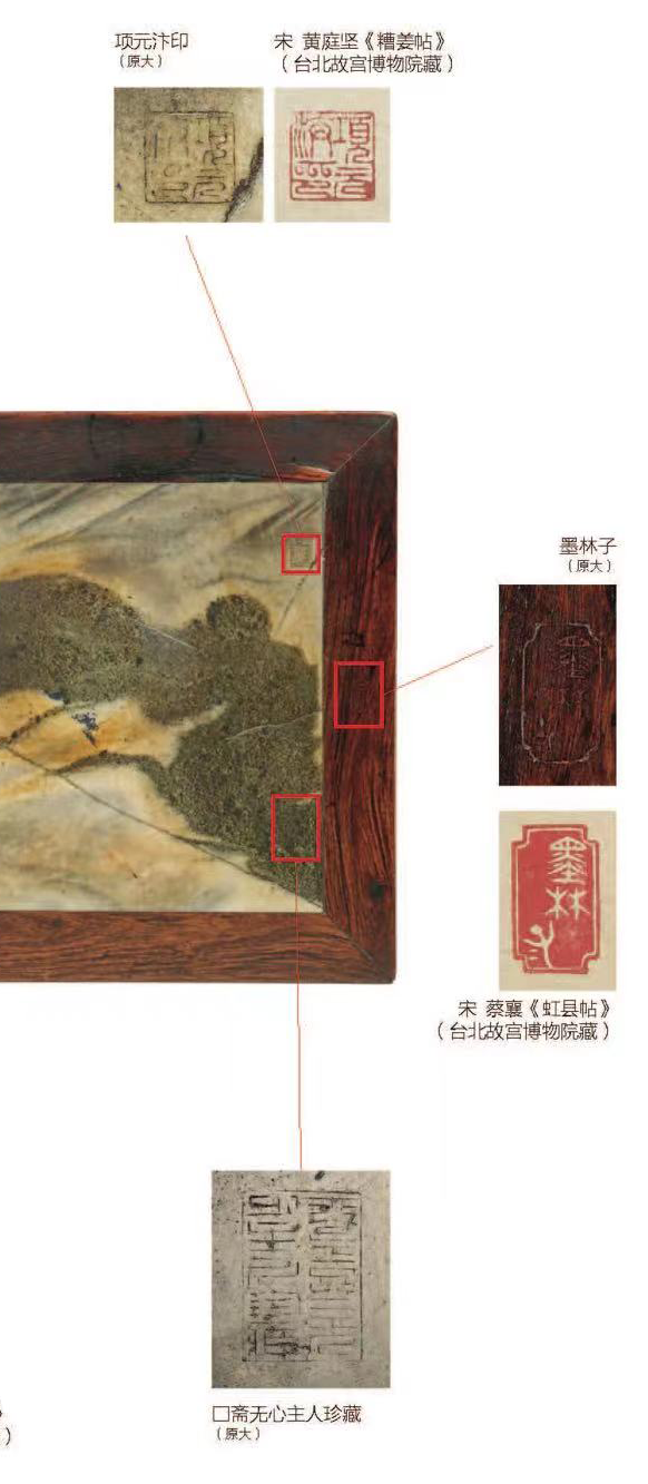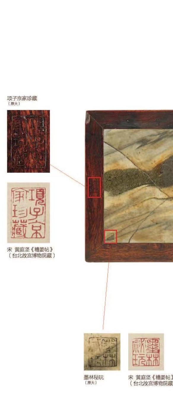 黄花梨原皮壳,如蜜如珀,红皮壳,上有温润包浆,有开片,显然几百年来历代主人精心擦拭、呵护,基本无修配,完整保存,亦属难得。大理石板随形磨制,石面有明显起伏,与边框结合处水乳交融,大开门。大理石白色地,年久泛黄,纹作“夏云图”,青黑色,微泛绿,作连绵起伏的山脉一道,自左往右倾仄,山前与山后均云气涌动,富于动势,呈千云过岭之势,气象万千,刹那云山,凝结于画面之上。大理石右上角刻方印“项元汴印”,左下角刻方印“墨林秘藏”;黄花梨边框右侧抹头正中刻委角长方印“墨林子”,左侧抹头正中刻长方印“项子京家珍藏”,两印皆填朱砂。查此四印为项元汴常用印,见钤于蔡襄《虹县帖》(台北故宫博物院藏)、仇英《汉宫秋月图》(台北故宫博物院藏)等书画,篆法相同,可资参考。大理石如画,边框如裱的锦绣,四印的布局,颇似一幅画卷上的钤印。在大理石右侧黑色石纹处尚有一印,不可尽识,为“□斋无心主人珍藏”。此印位置隐蔽,刻工工整,但刀法与风格与四印不同,字口风化程度也不同,推测为后世藏家所刻。倘再加以大胆揣测,“无心”为名,怕是时局多不如意,莫不是明清易代时的遗民?留待明家教我了。石面底泛黄,用托带两根。底面髹黑漆,漆质极为老旧,作碳化状,龟裂碎密。截面作倒圆状,这亦为明代晚期漆家具穿带常用线脚。边框大边、抹头木纹两两对开,显为一木剖成。冰盘沿仅厚2.7厘米,甚薄,且收进颇多,故整个几面造型如盘。大边、抹头相交不做透榫,而是在大边底部加设销钉加固,为文房器具榫卯方式。腿足极细,直径3厘米甚至微少,挓度大于常规,安装靠近两端。牙板和牙条为一木挖成,牙头长8.7厘米,挑出5厘米,其小、其精,亦为前所未见。牙头处微阔如耳垂,稍增沉稳,免于太过秀巧带来的纤薄之感。![]()