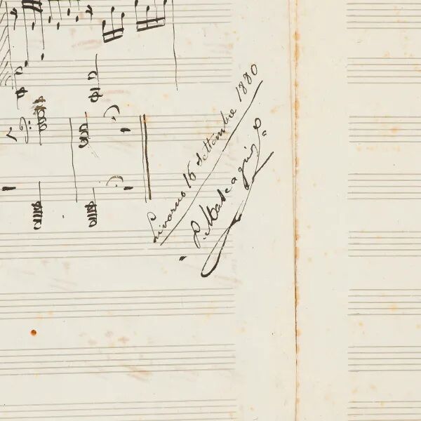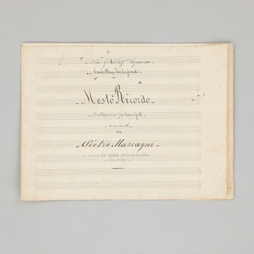 说明:卡洛塔·托卡丰迪(Carlotta Toccafondi)上款。此为《乡村骑士》作曲家马斯卡尼17岁时所作完整乐谱手稿五页。该手稿写于1880年9月16日。系名为《悲伤的回忆》的钢琴小夜曲,全曲一共四页,结尾处落有马斯卡尼签名:“里窝那,1880年9月16日,马斯卡尼。”乐谱中可见其涂改痕迹,应是马斯卡尼的创作手稿。上款人卡洛塔曾与马斯卡尼一同就读于凯鲁比尼音乐学院,极有可能曾为马斯卡尼恋人。时马斯卡尼方从凯鲁比尼音乐学院毕业前往米兰学院继续深造。作此曲或借以纪念与上款人卡洛塔在一起时的美好时光和即将离别的伤感。