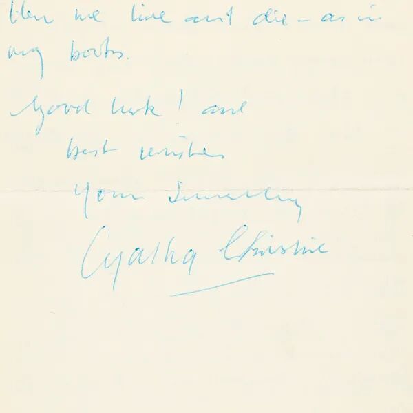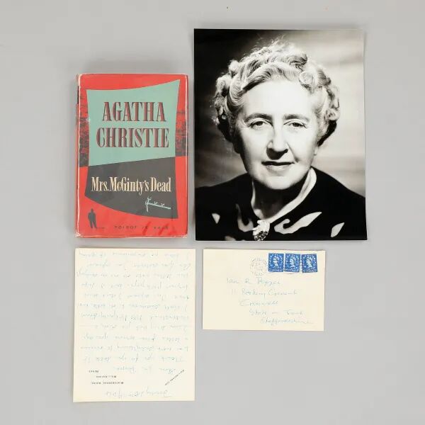 说明:此为英国推理女王阿加莎·克里斯蒂1964年作亲笔长信,带实寄封。上款人应为克里斯蒂的晚辈,很有可能为年轻读者。此信应系对上款人来信的复函,信中提到了阿加莎推理小说《清洁女工之死》,同时阿加莎引经据典,阐述了自己对自己作品的观点,并将自己的感受分享给了晚辈。阿加莎在信中写道:“很抱歉你不能理解《清洁女工之死》(Mrs.McGinty’s Dead),下次我会努力做得更好……如果你想要或需要建议,我会说,只需要看看阿尔伯特·爱因斯坦曾经说过的话——‘不要成为一个成功的人,而是寻求成为一个成功的人有价值的人。’我希望这些文字就足够了。祝你生活愉快。请记住,一些读者认为我的书阅读起来很慢且难以理解,或者觉得它们很荒谬或太复杂。但对我来说,它们很简单,而且长度恰到好处。我对他们显然更喜偏爱的那些书持有同样的看法。所以你看,伊恩,生活只是一系列持续不断的意见和选择,但正是这些意见和选择解析了我们生活的道路。我们靠它们站立或倒下,在某些情况下,我们也靠它们生存和死亡——就像我书中写的那样。” 《清洁女工之死》(Mrs.McGinty’s Dead)系1952年出版之阿加莎力作,其笔下塑造的经典侦探人物波洛在此案件调查过程中险遭意外,增加了悬疑和可看性。附《清洁女工之死》精装本一册(1952年由伦敦Collins Clear-Type Press出版,内页有藏者签名)及阿加莎·克里斯蒂经典黑白照片一帧。