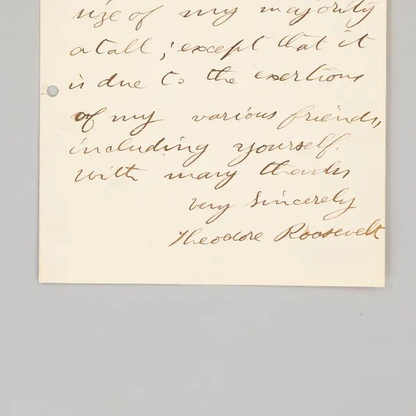 说明:约瑟夫·S·莱姆迈尔(Joseph S. Lehmair)上款。此为美国第26任总统西奥多·罗斯福24岁时亲笔信。作于1882年11月8日,即罗斯福以2比1的压倒性优势赢得州参议院议员连任的第二天。他在信中写道:“非常感谢你的祝贺。我根本无法解释我获得绝大多数票的原因。除非归功于我朋友们的努力,包括你。非常感谢……”。1880年,年轻的罗斯福就活跃于当地共和党政治活动,崭露头角。次年,23岁的罗斯福就赢得了州议会第21个选区席位,并于1882年11月7日再次当选连任。当年,他还出版了一本研究海军历史的书《1812年海战》,从而奠定了他作为历史学家的地位。