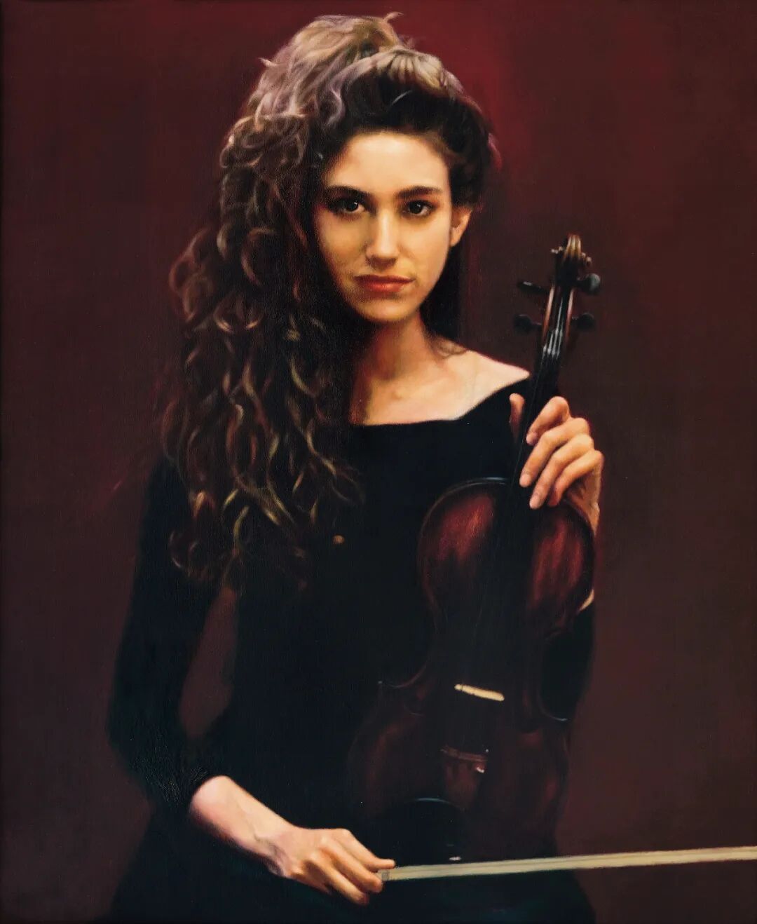 陈逸飞的绘画,因其精湛的写实技巧与诗化的浪漫主义风格而享誉海内外。二十世纪八十年代末期,陈逸飞开始创作“音乐家”系列。这一系列所画人物虽为现代优雅的西方女性,但却弥漫着如古典音乐般深沉又唯美的东方浪漫主义情调。《等待演出》的精湛技巧描绘了一位在后台静候登场的小提琴女乐手。她的眼神注视着观众,目光坚定充满自信,但略显羞涩的浅浅微笑将其候场时忐忑紧张的精神状态也同时刻画了出来。大面积的深色背景与人物服饰以及乐器色彩和谐呼应,更加突出小提琴手高贵典雅的气质,同时也将她缓缓的推到了画面的前台,营造出一种神秘舞台性的效果。这一系列承接了九十年代中国古典仕女系列,因此也是陈逸飞绘画生涯中的重要时期,且因为作品数量较少而倍显珍贵。