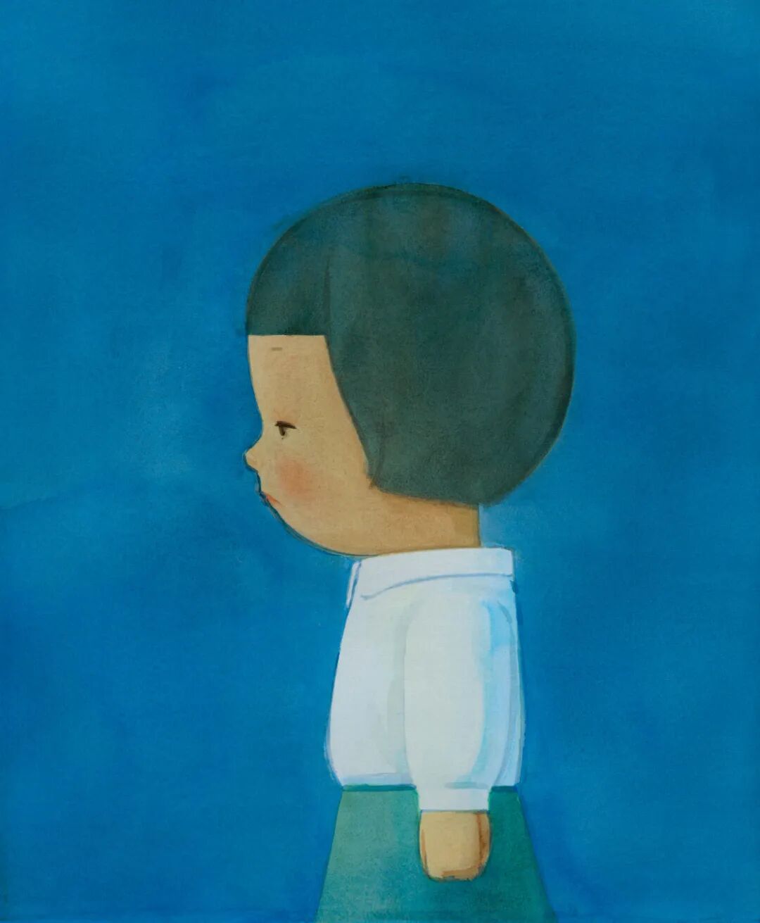 刘野从2000年之后开始创作“小女孩”系列,这个系列包含了小女孩的正面、侧面、背影,以及与蒙德里安画作的结合,艺术家讲述的无数个似真似幻的小故事,就像童年的好时光一样让人回味。创作于2014年的《无题之三》中,一个小女孩侧身而立,大头齐刘海的造型简约生动,闷闷不乐的委屈神情令人同情又忍俊不禁,颇有卡通人物的诙谐、夸张之趣,尤其对于女孩眼神与小嘴的刻画可谓信手拈来的神来之笔。此作中尽管没有出现蒙德里安的画作,但却延续了前者的创作理念:小女孩的形态被简化成几个大小不等的几何形,相互套叠,背景是大片纯净的天蓝色,完全以平涂而出,艺术家不再重视真实性和空间深度,而是纯粹以色彩传达出平静、忧郁的情绪,通过对世界的内省与洞察创造出秩序与均衡之美。