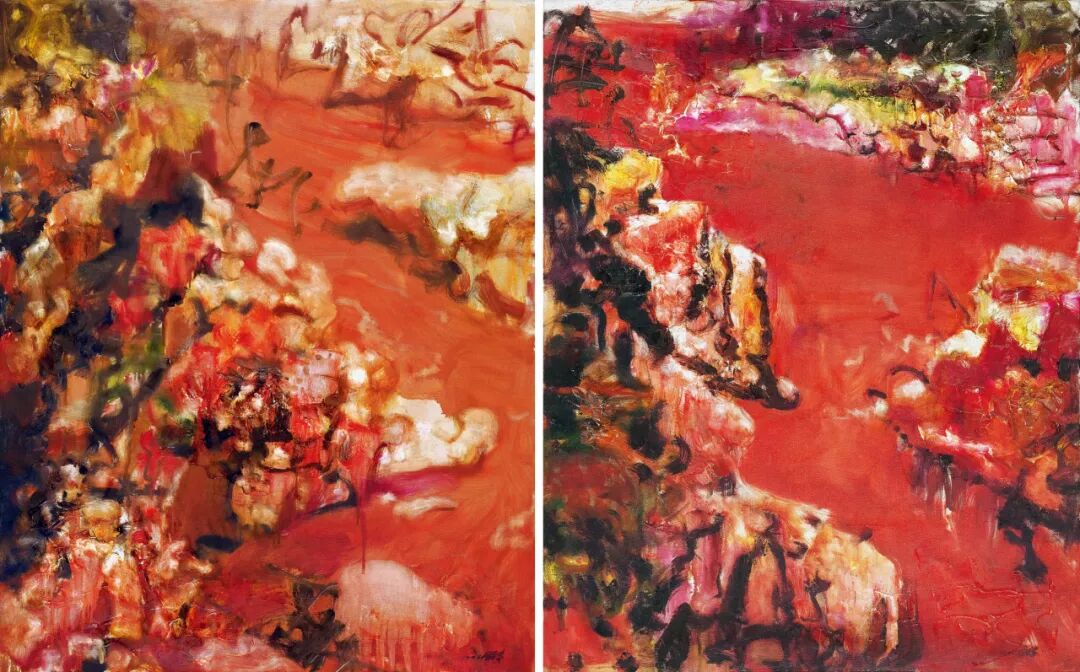 此组《雅安红石》作于1994年,类似于传统绘画中“对屏”的形式,与《石头系列—雅安上里》三联画作于同一时期。从后者可知,“红石”这一素材乃是来源于有着目前世界规模最大的红石滩的雅安地区。具体而言,红石是一种散落在山间尤其是溪水流经之处的石头,其表面附着一层极其稀有的红色藻类,在不同的季节和气候状况下会幻化出不同的色彩。画家显然被这种石头独特的形制与奇妙的光色效应所吸引,进而开启了“山石”系列中的重要分支—“红石”系列创作。