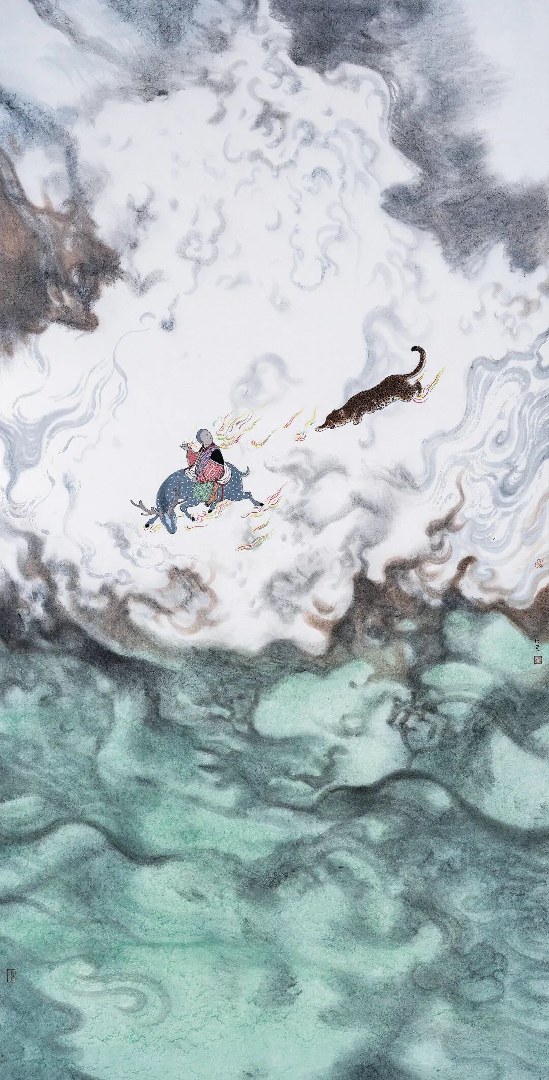 林于思曾在广州美术学院中国画系学习多年,他从传统以及学院的训练中汲取有益的养料,再秉承自身的个性予以富有意趣的发挥。他通过绵细的笔线和层层晕染烘托出亦真亦幻的山岚水影,置身其中的人影和鸟兽则别具一种幽然而空灵的意味,给人一种与传统的冷逸截然不同的亲切感,其不动声色的“幽默”拉近了与观众的距离。