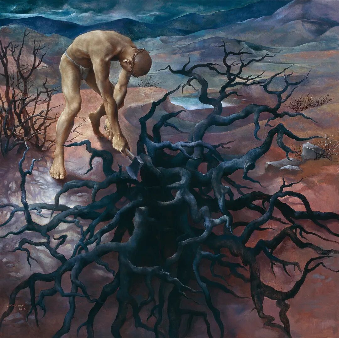 章犇作为最早进入二级市场的80后艺术家之一,2015年《章犇·异乡》展览曾作为北京民生现代美术馆建馆后第一个青年艺术家项目备受瞩目,本次上拍的作品《白光》也参与了该展览。章犇早期的作品中“人”可以视为一种象征符号,一个充满忧郁质和负重的形象,充满了与自然对抗的张力,在《白光》这种张力透过错综盘杂的树根与环境合奏成新的隐喻。