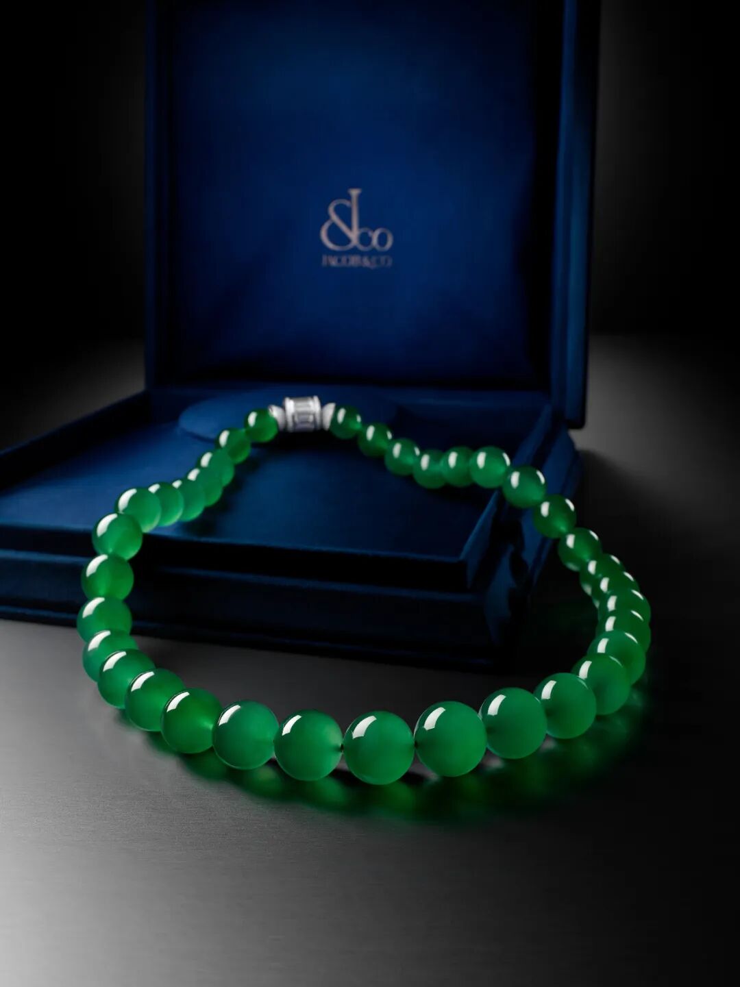 一共35颗品质上乘的天然翡翠珠串成的项链,由Jacob & Co.专门为客户特别定制,体现中西合璧精神。