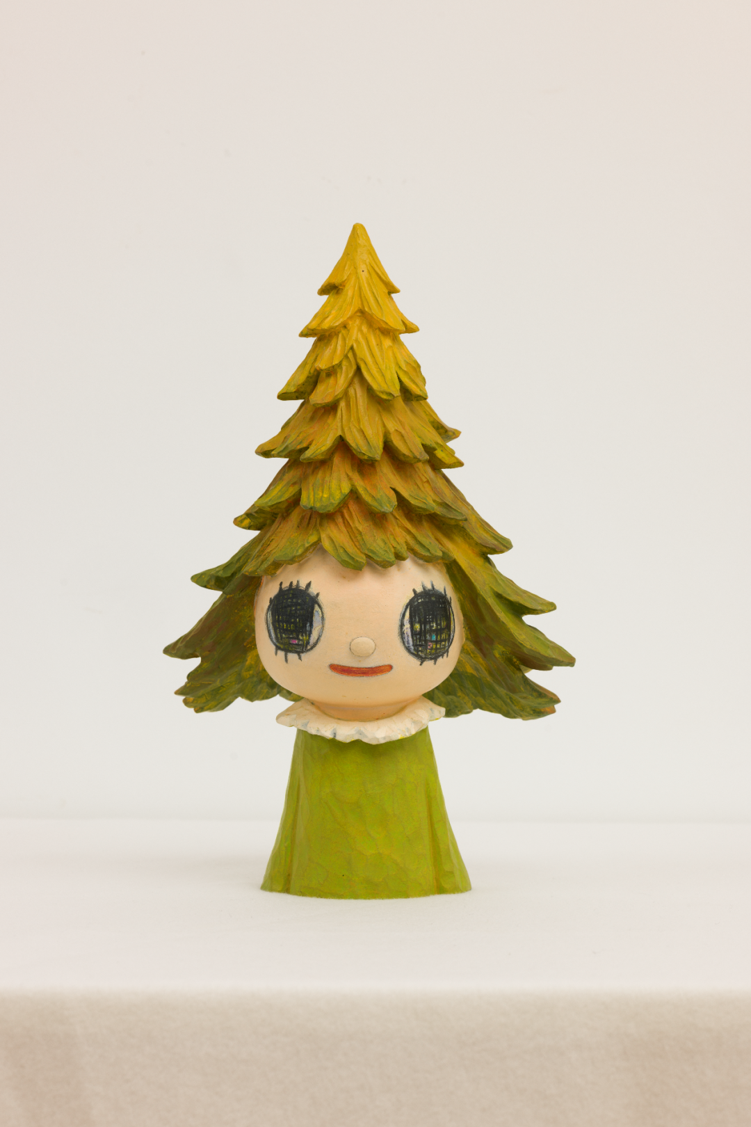《森子》的身形比例犹如晴天娃娃,大大圆润的头,配上巧小可爱的身躯,树状发丝层层堆叠的起伏、轻盈外翘的发尾、盈盈笑意的大眼,带点一丝丝的愉悦、一些些的轻盈,在光线照射下会折射出斑驳的翠绿、棕黄散发着快乐的疗愈氛围。 藉由《森子》的诞生,奈良企图以孩童纯真的角度,跳脱以往作品的诙谐、讽刺印象,希望藉由森子的温暖清新,提醒着世人大自然所馈予人类最珍贵的宝藏。