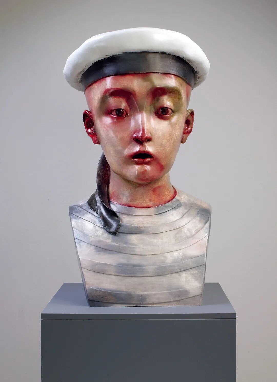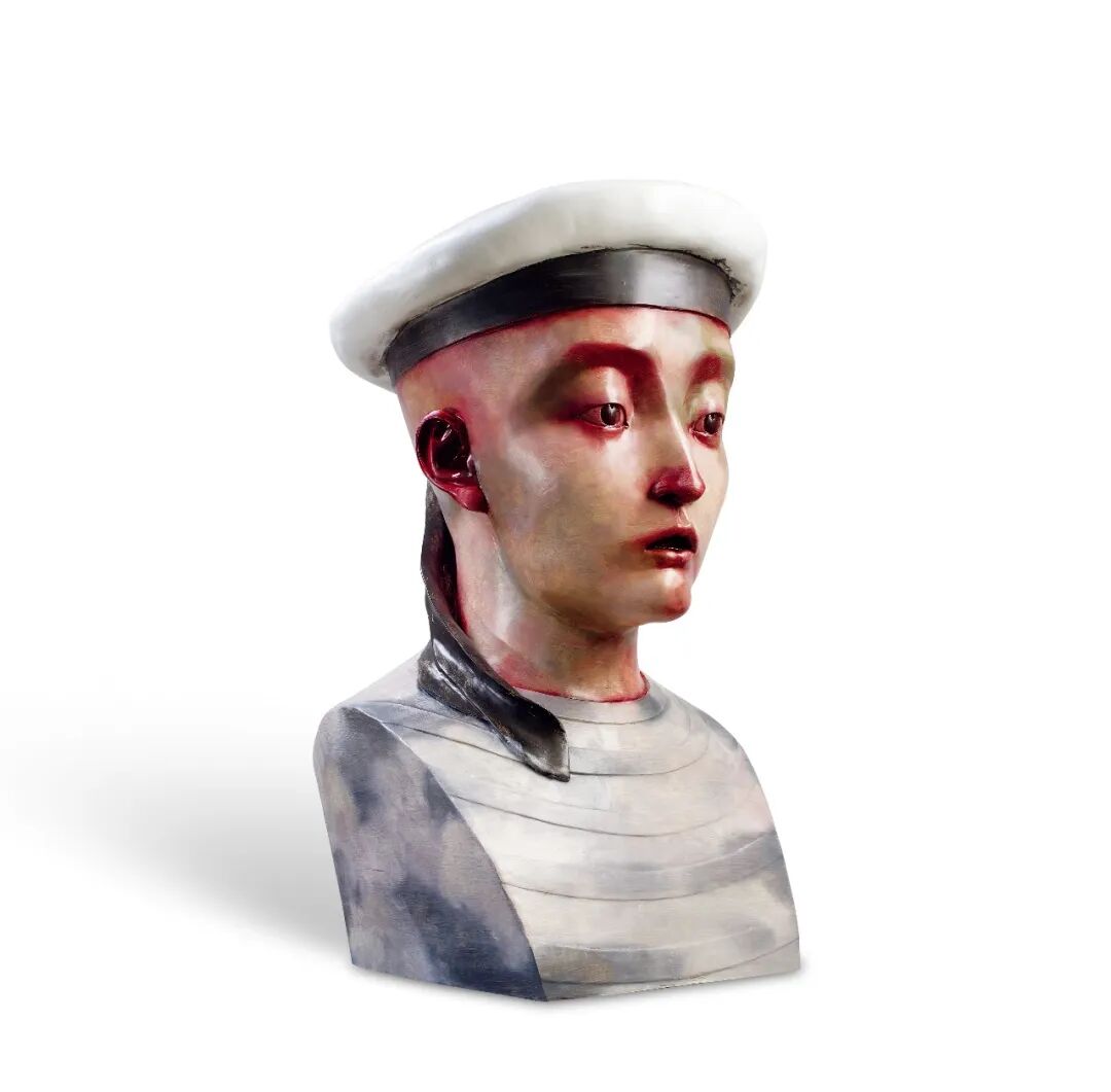 在《儿童水手》这件作品中,人物形象一如既往地流露出张晓刚符号般的脸谱模样,整件雕塑作品被谨慎而精致地赋色,面部本来的红色和暗部的绿色形成对比,衣物则覆盖以不同深度的灰,有着超现实的表现效果,同时色彩的选择又受到了唐釉和古代埃及彩色雕塑的影响。超过五英尺的巨大尺寸半身像,有着鲜明的现实主义风格的制式,也同时让我们联想到用于国家特定场合的大型雕塑,呼应了张晓刚绘画作品中对特定时代的刻画。