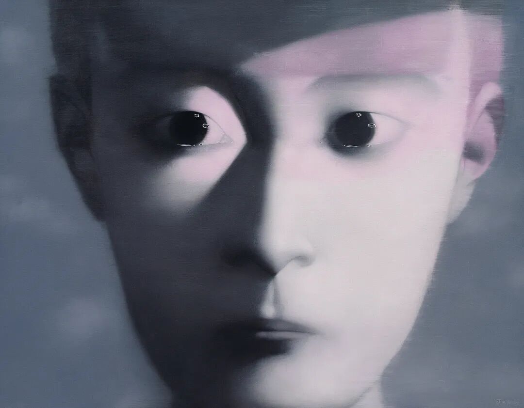 1993年,张晓刚逐渐摒弃了印象派和表现主义风格,受到雷内玛格丽特和格哈德里希特的影响,开始通过照片语言的图像化转释、超现实主义的氛围感描述,创作了他日后蜚声国际的“血缘大家庭”系列。这个系列前期作品通过脸谱化的造型,表现出集体主义之下对家庭与成长的关注,并对社会之中所有的血缘关系进行阐述。随后的创作推进中,艺术家的作品逐渐更多集中在对个体人物的观察与描述之中,并逐步聚焦面部特写。