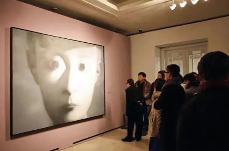 《血缘》有着近2米的尺幅,人物面部被放大至如此巨大的尺寸,肖像开始变得陌生。在加上艺术家对人物面部处理的独特手法——外轮被刻画得相当模糊,背景被高度虚化,人物被艺术家处于完全悬置的状态。没有任何供观者阅读多余信息,只有黑白棱角分明的五官,瞪得巨大的眼睛,紧闭的小嘴,眼珠挂着泪滴,以及从右到左打在脸庞上的的淡玫红色。剩下的则有“一段被模糊掉的历史和生活,一个个在公共标准下顽强挣扎的灵魂,一张张似乎平静如水但又充满内心复杂情结的脸,在矛盾中生息的暧昧使命代代相传。”