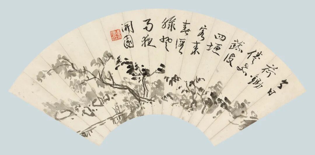 《小桥策杖》为黄宾虹1930年代作品,画家以淡墨勾勒林木,加以半抽象的皴擦,营造清淡幽寂的氛围,烘托出小桥上携杖而立的高士背影。拍品系“白宾虹”面目之一例,画上题钱宰诗,“客来春酒绿,风雨夜开园”之句合于画中情境,疏澹旷远,神致萧散,实属文人画之逸品。
