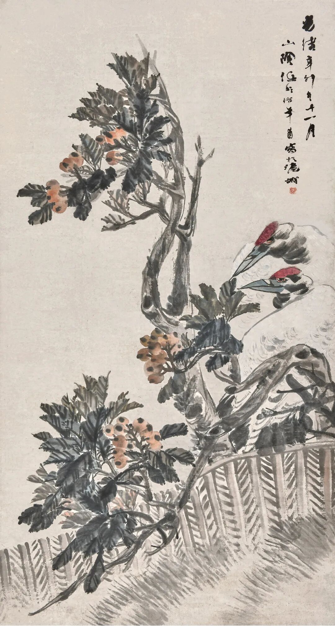 此帧作于1891年,写庭院一角,竹篱茂草间,枇杷枝干横斜,上下呼应,姿态全自胸臆中出,毫无摹袭古人的痕迹,老笔纷披,墨色交融,皆觉质地浑厚,作风老辣。一对仙鹤缩颈相对,虽只占据一侧,不在画面中心,却令整幅精神全出。