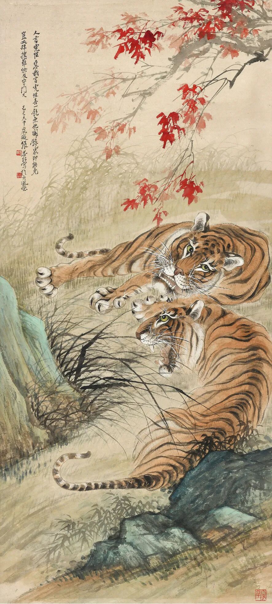《秋陂双雄》作于1929年,状写两只猛虎栖息于山石、茂草与红叶间,其一若欲起身,张口咆哮;另者虽通身安卧,却兽面微抬,露出利齿,动静之间,俨然都具有不可凌犯的威严。张善孖把握到这紧张的一瞬,虎啸秋风皆扑面而来,可见画艺之精湛。