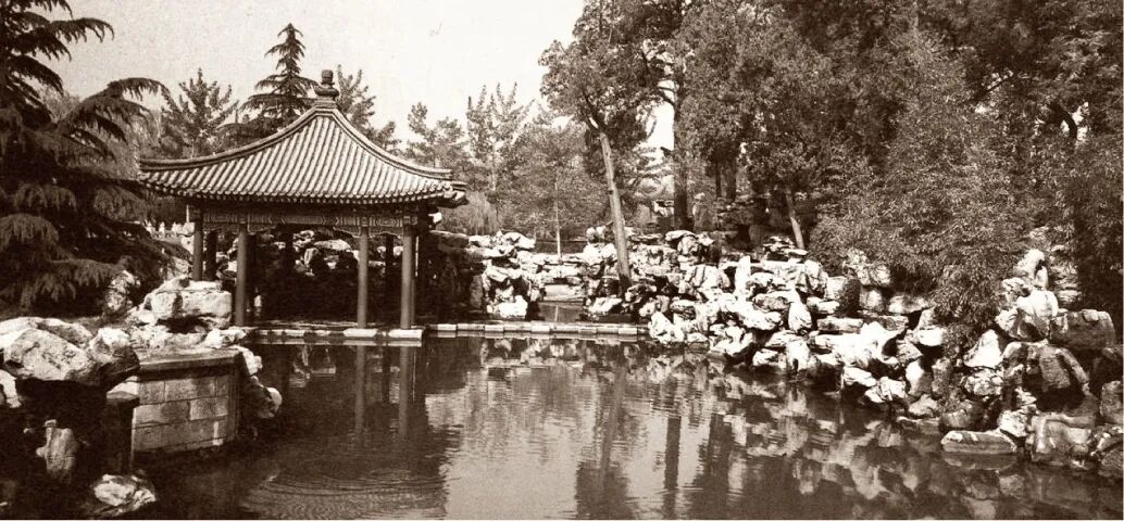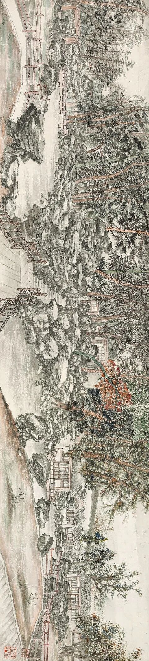 1913年,袁世凯迁家眷进中南海,袁克文入住流水音,这是一座四方流杯亭,原是君臣修禊觞咏之地,因乾隆帝书匾“流水音”得名,袁氏交游既广,此地遂为诗酒唱和所在。拍品脱胎于廉泉的现场摄影,卷首为日知阁,卷末即流水音,通幅纯以细笔,描摹精微逼肖,与实景几无差别,极见精心。