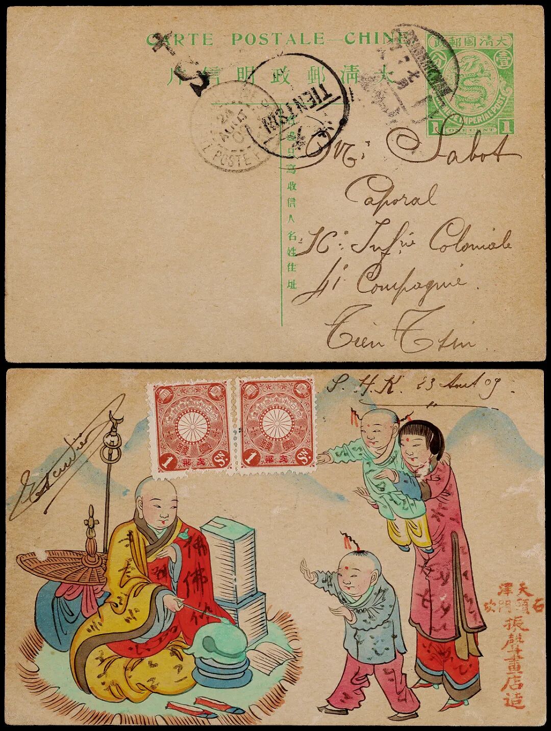 清四次邮资片1909年山海关寄天津,盖山海关已巳七月初八英汉腰框干支日戳,经天津法国客邮6月24日中转,有天津到戳,片背手绘彩图:小脚娘子抱携二子山中拜访敲木鱼的佛生,天津石头门坎振声画店美绘,片品上佳
