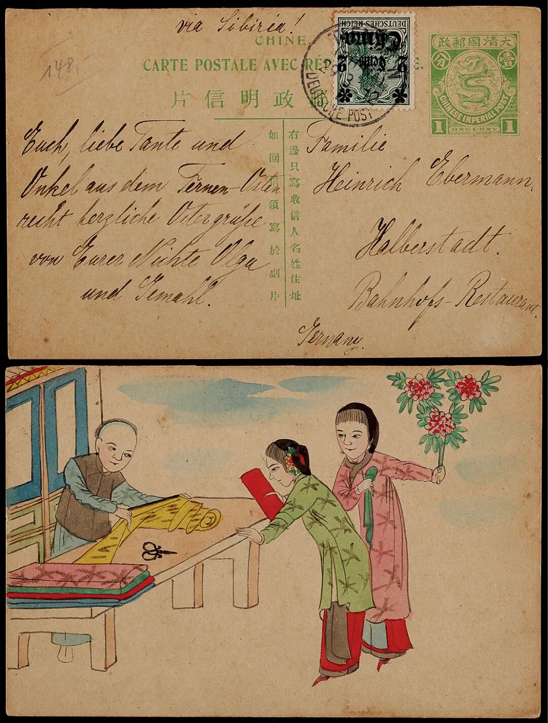 清四次邮资双片之正片1912年天津寄德国,加贴德王像加盖花体“China”改值2分邮票一枚,盖天津德国客邮3月29日戳,片背手绘彩图:裁缝店男主与二位小脚美女,布匹、剪子、鲜花一应俱全,神态表情丰富,画工精美,片品完好