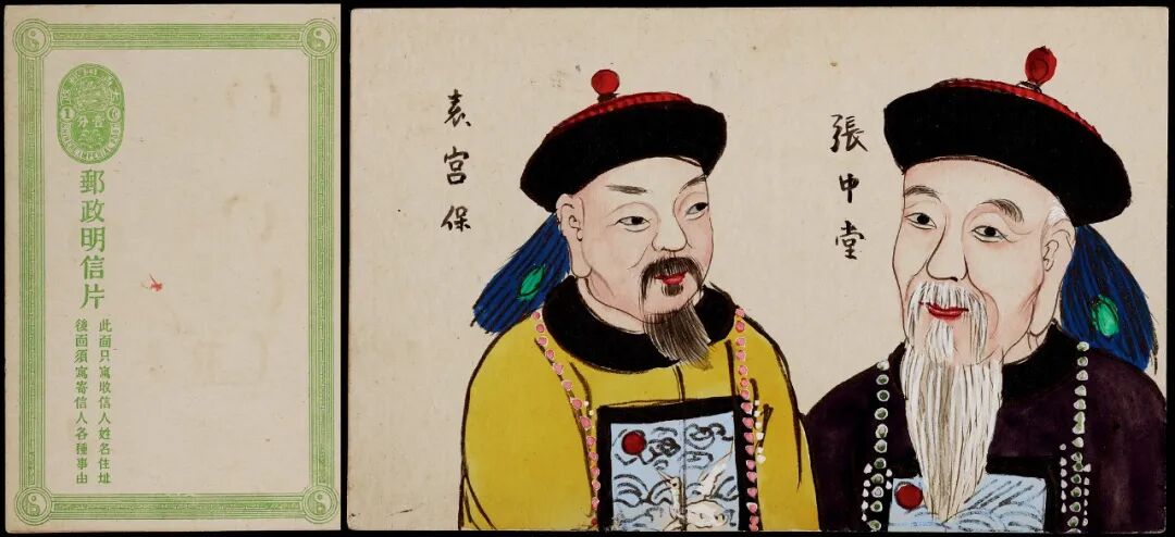 清三次邮资片未使用手绘,片版式:A框距118mm、B图距4mm,片背手绘彩图:清官袁宫保、张中堂大人双人画像,画技高超,人物逼真,片品上佳