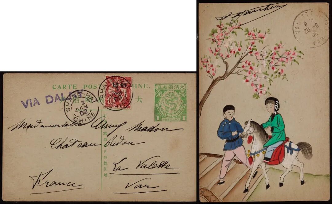清四次邮资片1909年上海寄法国,加贴法国客邮加盖改值四仙一枚,盖上海法国客邮6月2日戳,经大连邮路,有法国6月20日到戳,片背手绘彩图:马夫手牵女子坐骑之白马过小桥,人物神台表情各异,画工精细完美,片品上佳