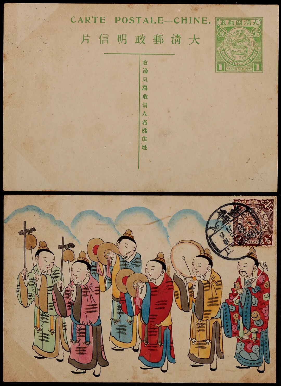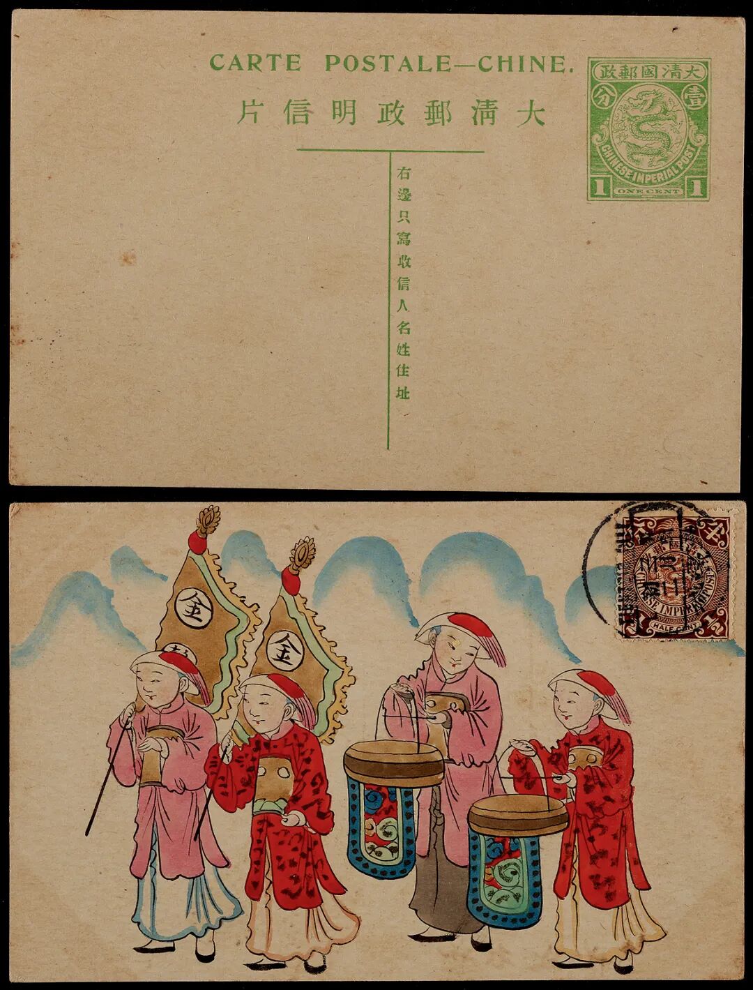 清四次邮资片未使用手绘,背贴蟠龙半分一枚,盖销天津城庚戌三月初二英汉腰框干支戳,片背手绘彩图:民乐队一行六人,画工精美,保存较好