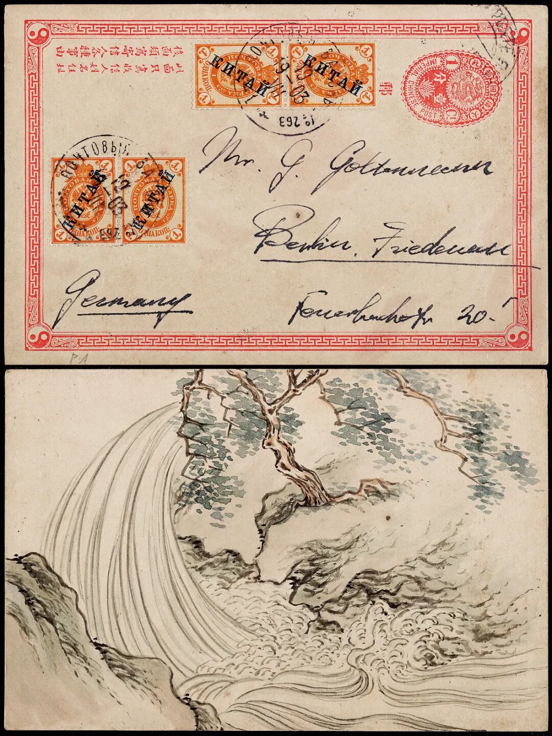 清一次邮资片1903年北京寄德国,加贴俄国客邮加盖1戈币邮票四枚,盖北京俄国客邮7月19日戳,有德国不清晰到戳,片背手绘彩图:瀑布激流中大树,画工精美,少见,佳品