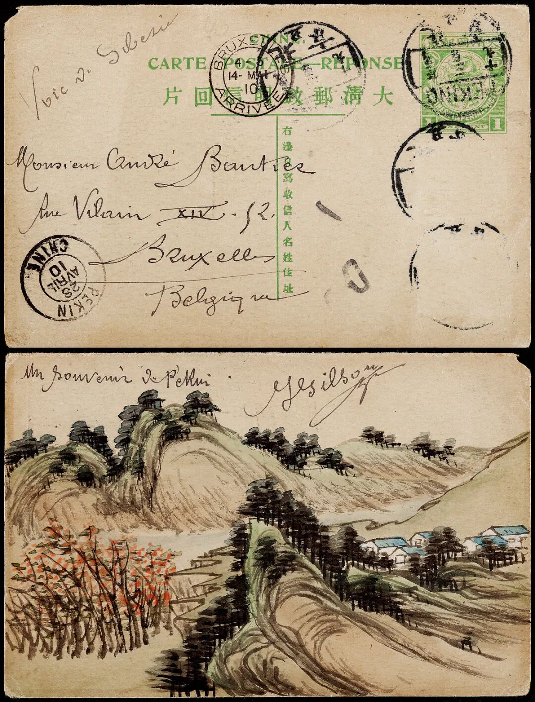 清四次邮资双片之回片1910年北京寄比利时,加贴邮票失落,盖北京庚戌三月十九英汉腰框干支戳,有北京法国客邮4月28日中转、比利时5月14日到戳,片背手绘彩图:深山美景图,画工精细,耐人寻味,保存较好