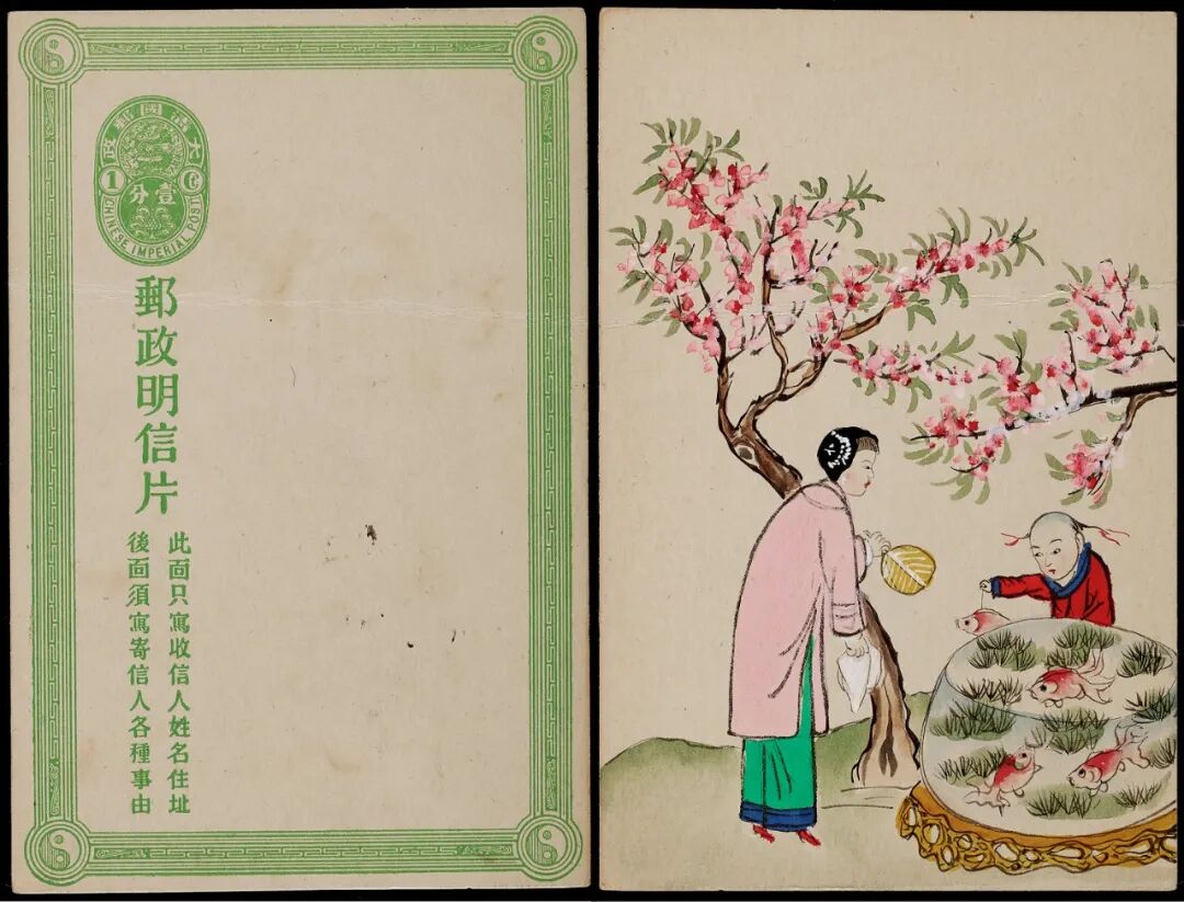 清三次邮资片未使用手绘,片版式:A框距119mm、B图距4mm,片背手绘彩图:桃花树下母子二人观赏盛水盆中金鱼,画工精美,片中上部小有软折,保存较好