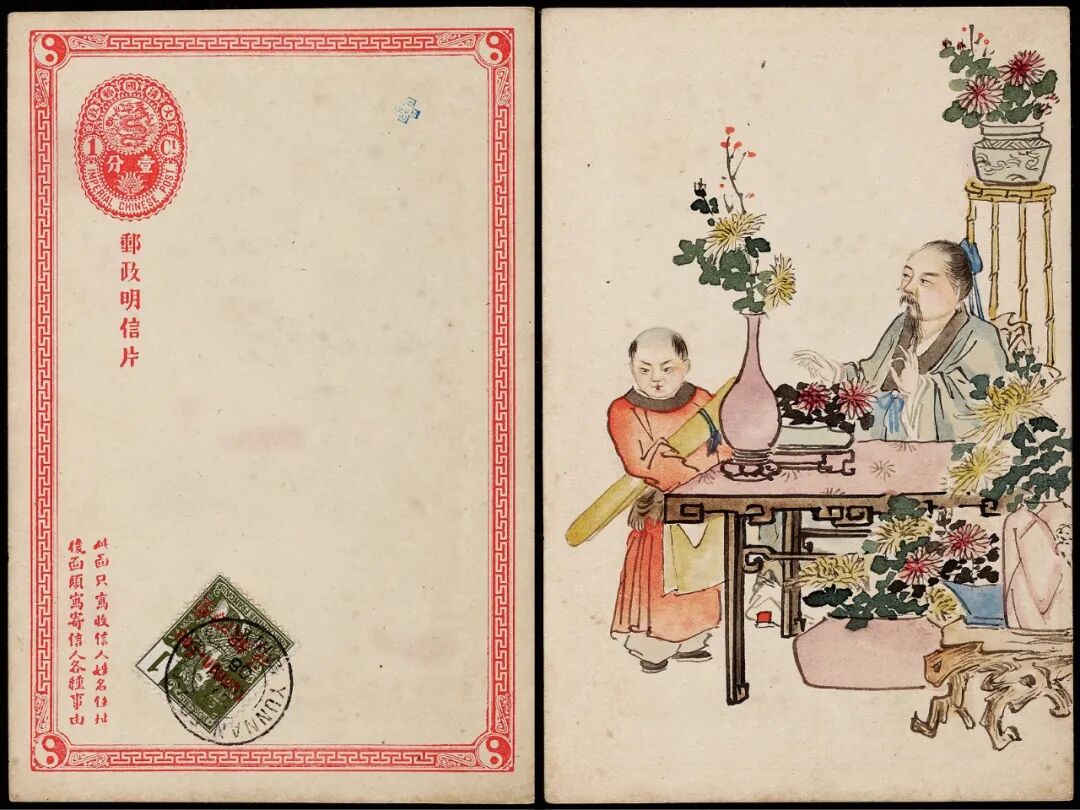 清四次邮资片未使用手绘,片背手绘彩图:敎书先生传旨下跪学子,三人神态表情不一,颇为有趣,画工精细,保存完好