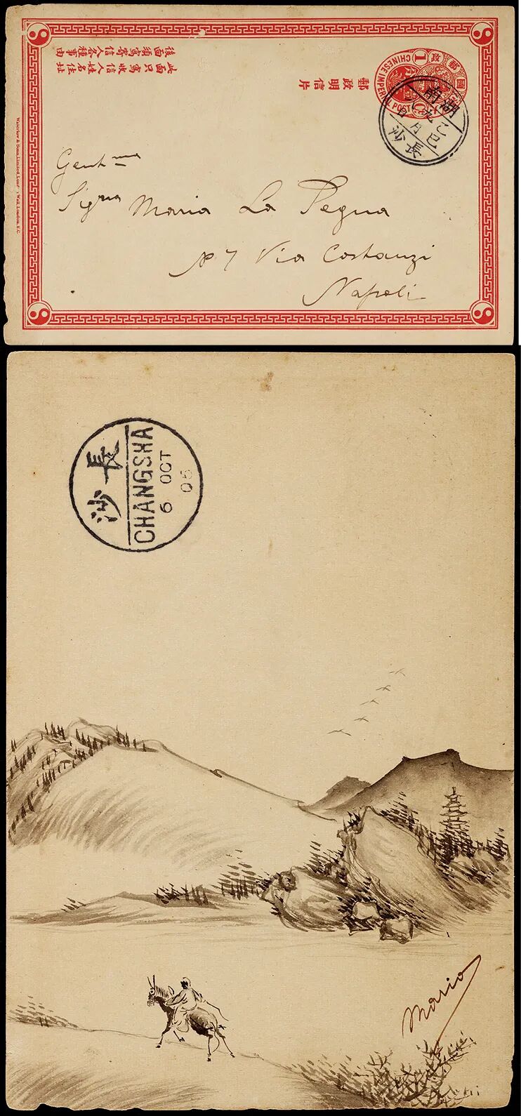 清二次邮资片1905年长沙寄本埠,分盖湖南长沙乙巳九月八日双圈小三格干支日戳发出,落地长沙10月6日汉英半切小圆到戳,片背水墨图:山中驿使行进,画工精细,片品上佳