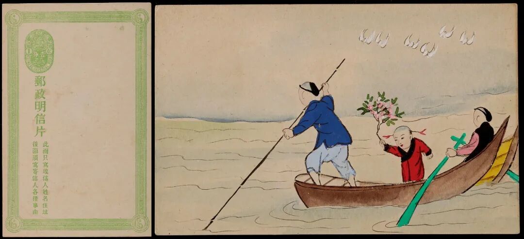 清三次邮资片未使用手绘,片版式:A框距117.5mm、B图距3.5mm,片背手绘彩图:江河岸边小船待发,天空海鸥飞翔,孩童手举花束致意,十分可爱,画工精美,片品上佳