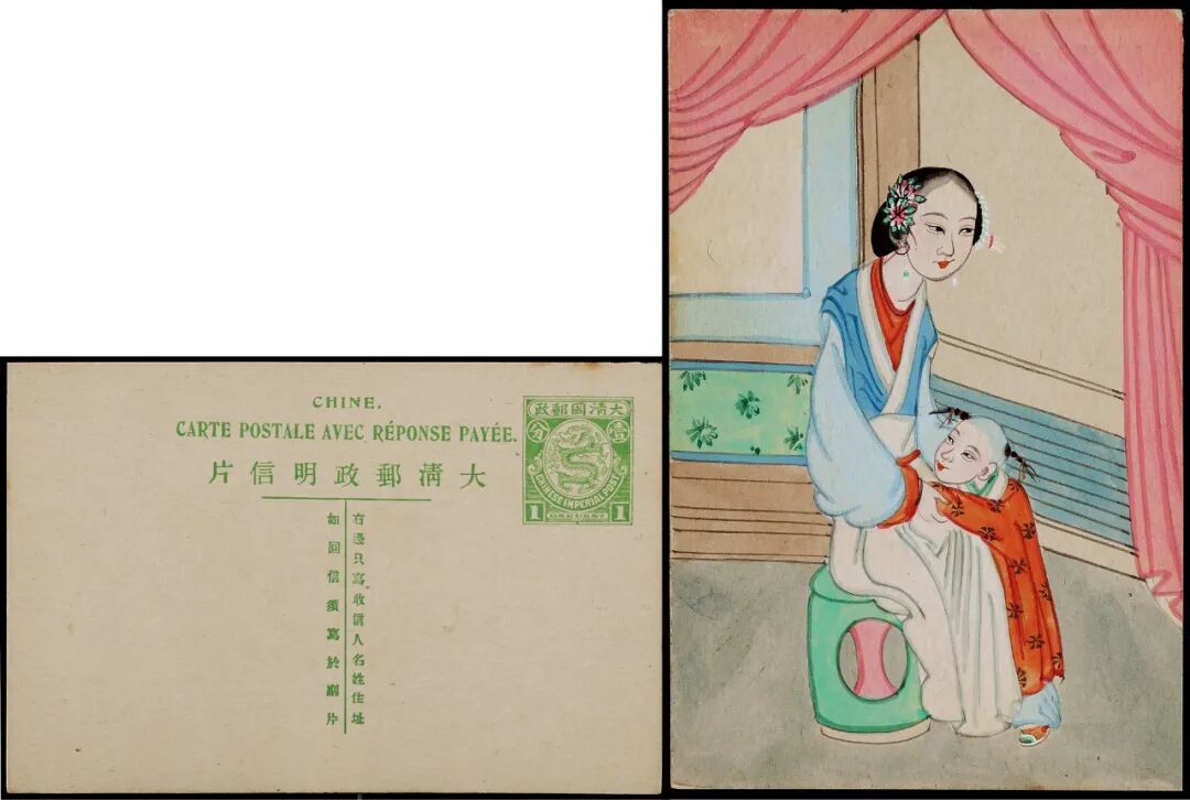 清四次邮资双片之正片未使用手绘,片背手绘彩图:端座娘子与膝前小公子,构图品趣,画工精美,保存完好