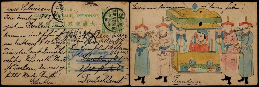 清四次邮资双片之回片1910年天津寄德国,所贴邮票失落,盖天津6月15日-天津法国客邮同日戳中转出口,片背手绘彩图:四抬大轿载运官夫人,人物神态表情抬夫严肃,夫人喜悦,画工精美,保存完好