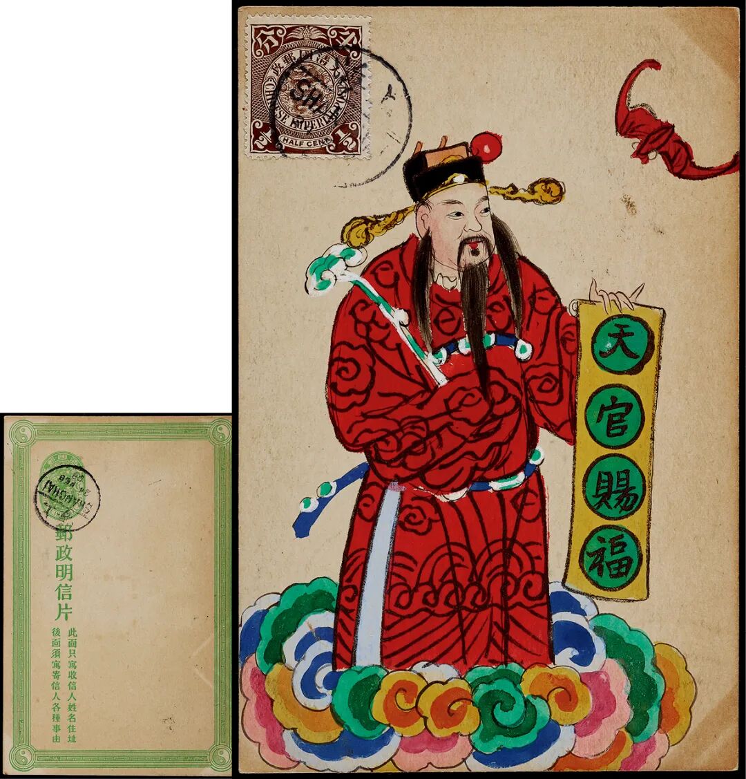 清三次邮资片1908年盖销手绘,贴蟠龙半分一枚,盖上海2月24日汉英半切小圆日戳,片版式:A框距119.5mm、B图距4mm,片背手绘彩图:神仙天宫赐福手持如意图,画工精美,上色鲜明,片品完好