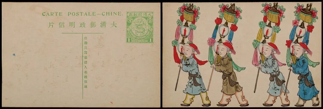 清四次邮资片未使用手绘,背贴蟠龙半分一枚,盖销天津城庚戌三月初二英汉腰框干支戳,片背手绘彩图:扛金旗提龙牌一行四人,画工精细,配色协调,片品完好