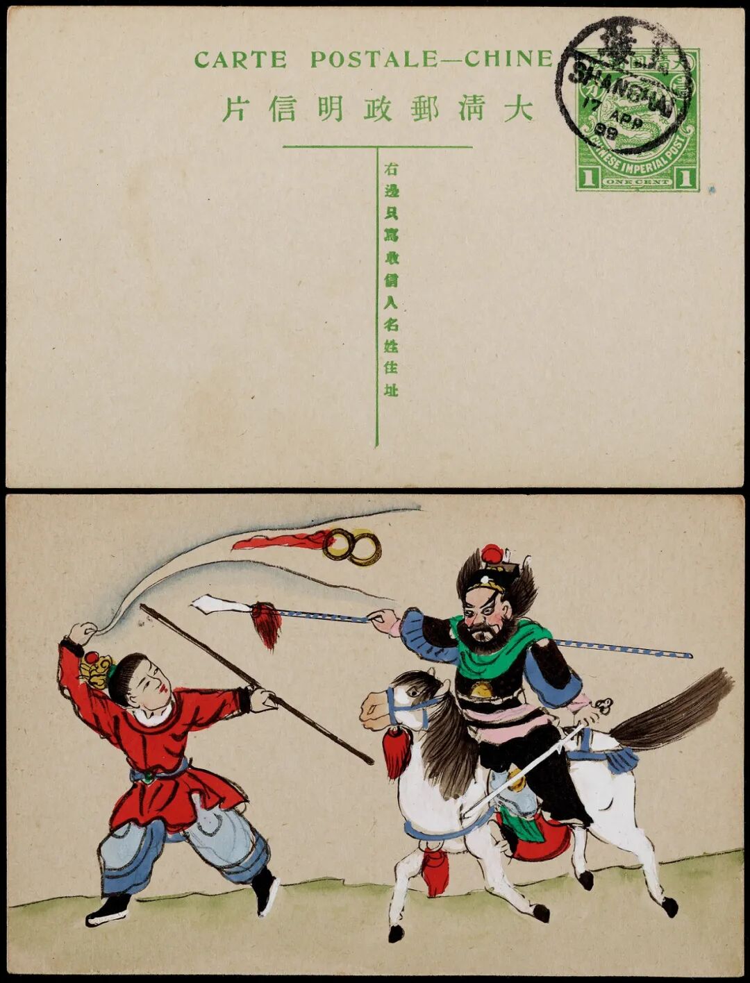 清四次邮资片1909年盖销手绘,盖上海4月17日汉英半切小圆日戳,片背手绘彩图:骑马武将与子习武,画工精美,耐人寻味,片品上佳