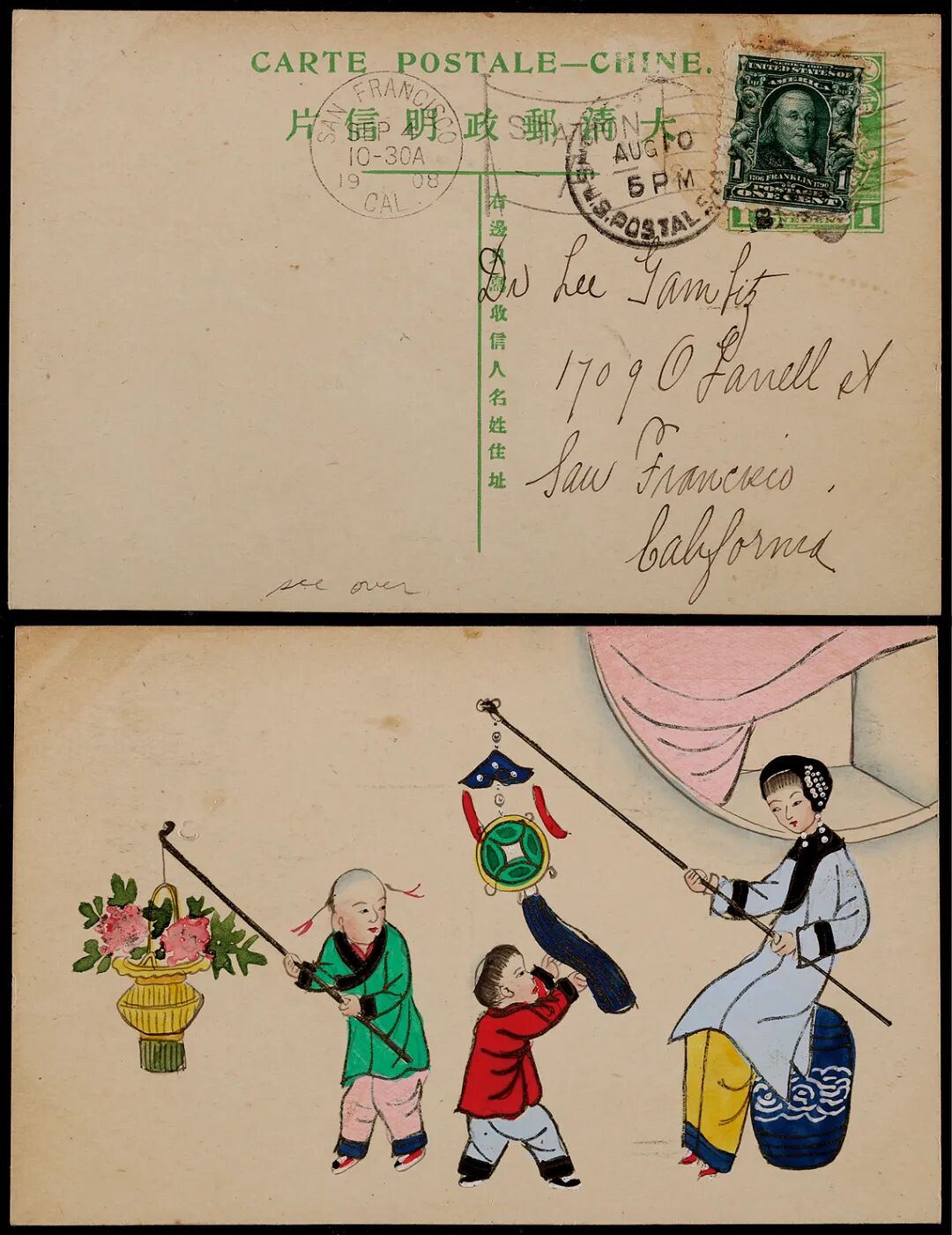 清四次邮资片1908年上海寄美国,邮资图庶贴美总统像1美分邮票一枚,盖上海美国客邮8月10日戳,落地机盖美国9月4日到戳,片背手绘彩图:粉红窗帘外母子三人戏玩,画工精细,上色完美,片品上佳