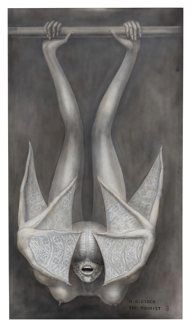 此外,吉格尔绘画的生物形态怪异,但却带有一种超自然和明显的人类美态,成为其作品能跨越文化引起共鸣的关键。他以喷枪创作的《旅客IX》(The Tourist IX) 正好体现这一点,作品将人类和奇异的形态结合,形成令人不安却又迷人的效果。