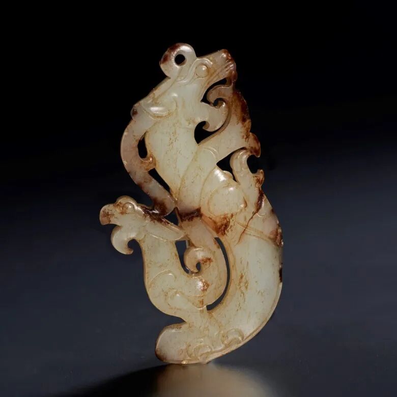 战国晚期龙形玉佩,长 9.1 cm.。此拍品于2021年12月3日香港“云中玉筵 重要亚洲私人古玉珍藏:春秋战国篇”拍卖以15,250,000港元成交