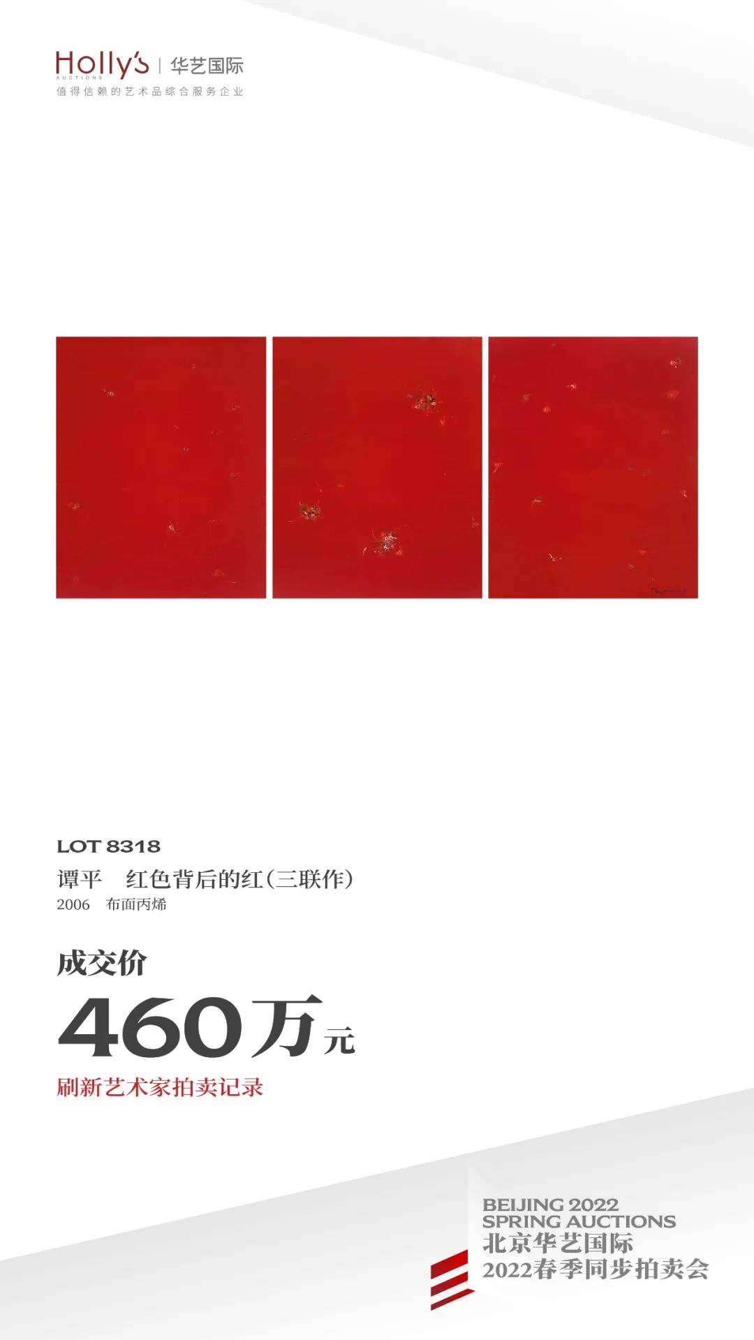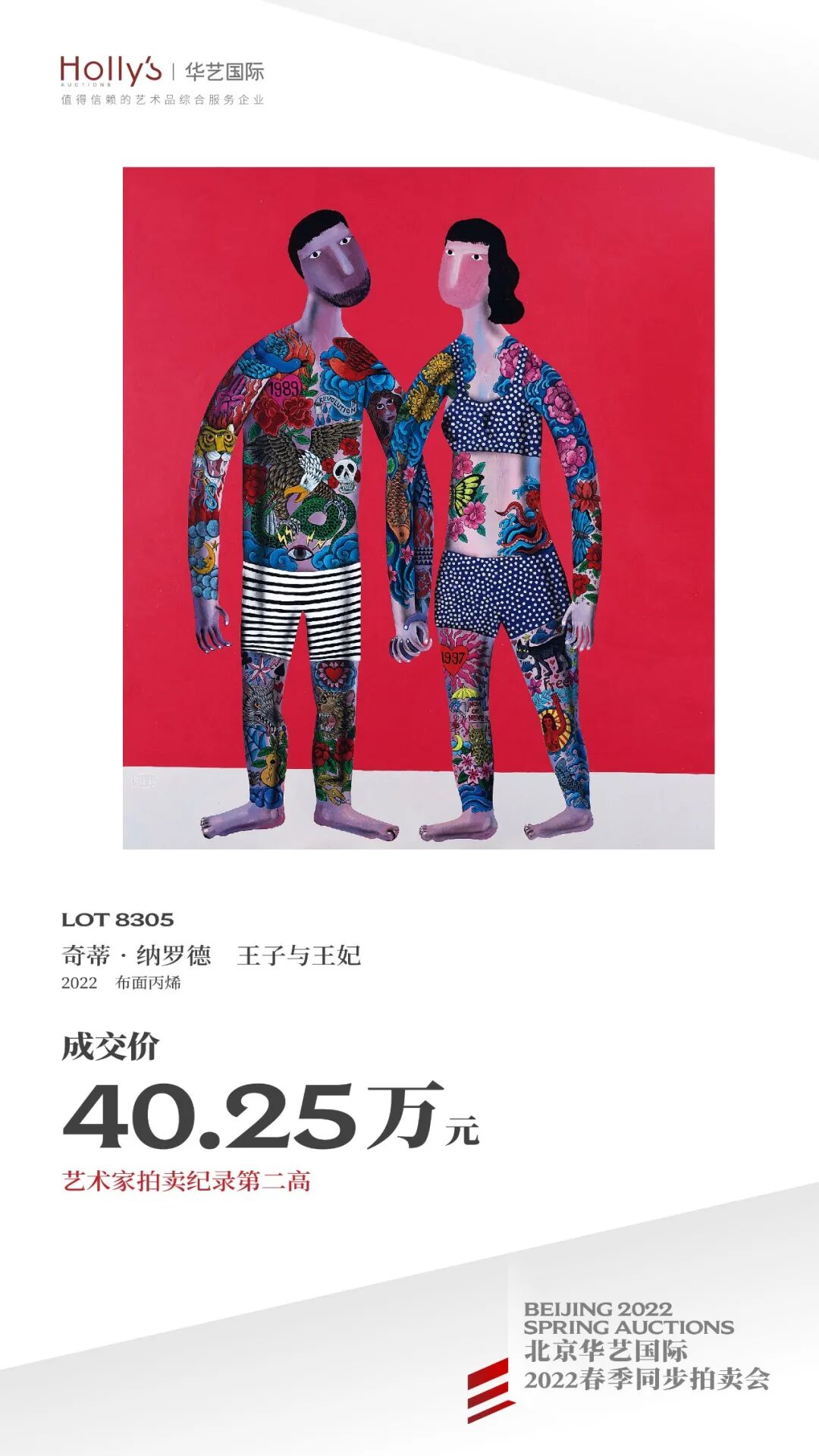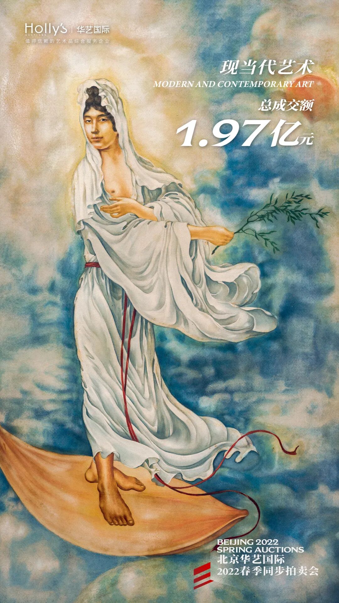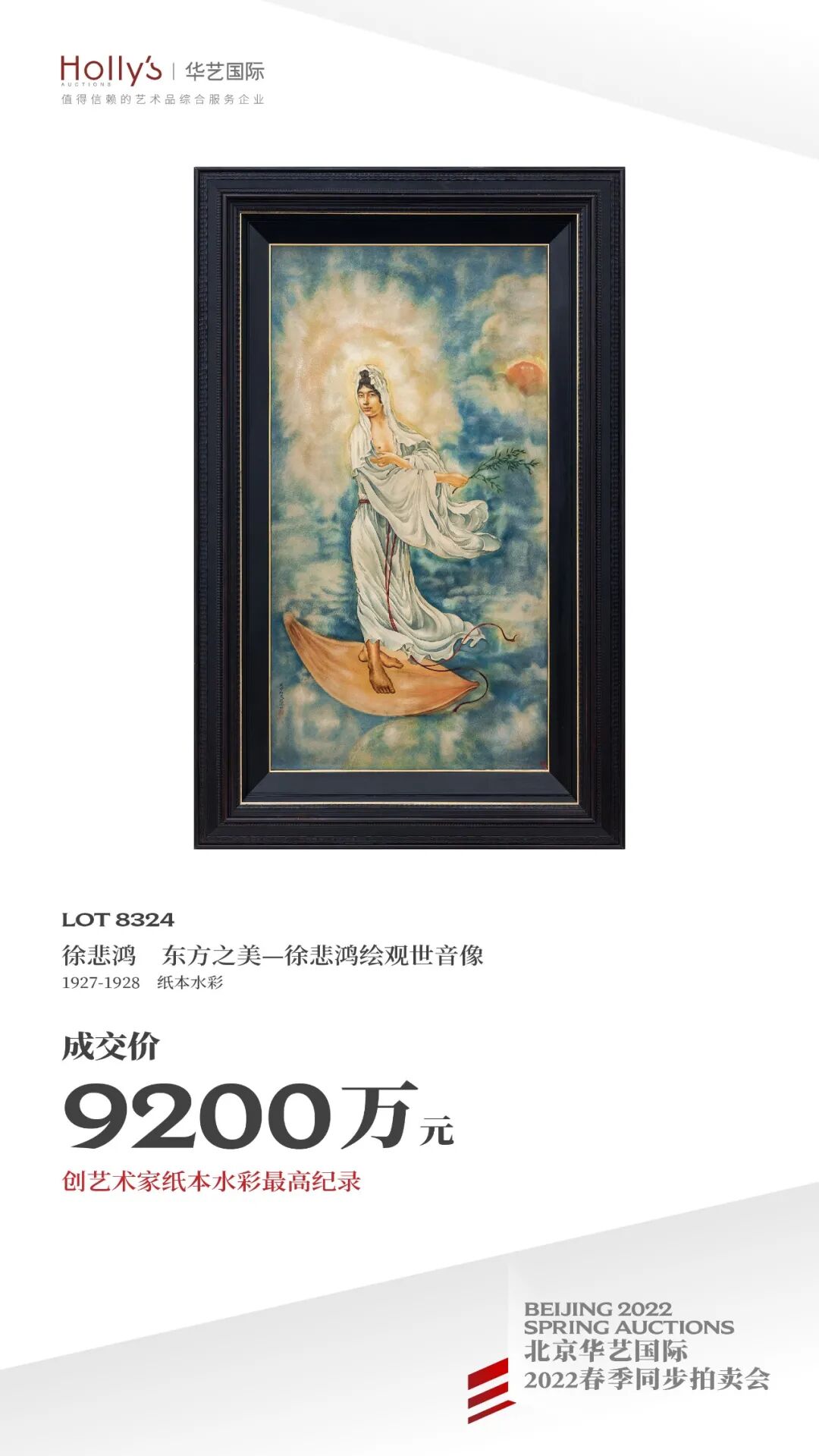 其中,现当代艺术夜场闪耀夺目。徐悲鸿《东方之美—徐悲鸿绘观世音像》摘得专场桂冠,斩获成交价9200万元,成为2022年春季内地最贵拍品,创艺术家纸本水彩最高纪录。张晓刚《血缘》以1357万元成交;王沂东《约会春天》以1265万元成交;藤田嗣治《抱猫少女》成交价1058万元。谭平、高瑀、李继开、全光荣、伊斯沙克·伊斯梅尔、安娜贝尔·德哈特、苏菲·冯·海勒曼7位艺术家刷新个人拍卖纪录。