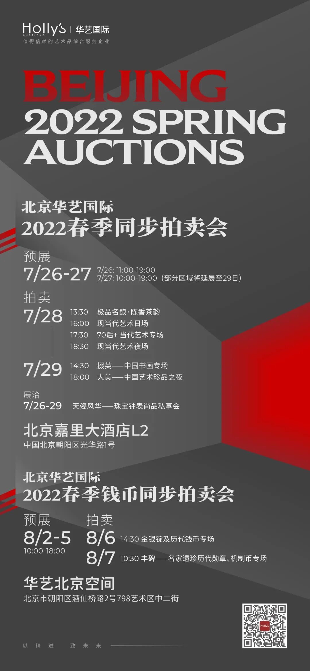 7月29日,“掇英——中国书画专场”“大美——中国艺术珍品之夜”两大专场,依次举槌。拍卖日程安排详情如下,点击图片可查阅华艺在线APP或华艺淘珍小程序同步拍电子图录,参与网络竞拍。恭候各位藏家光临!