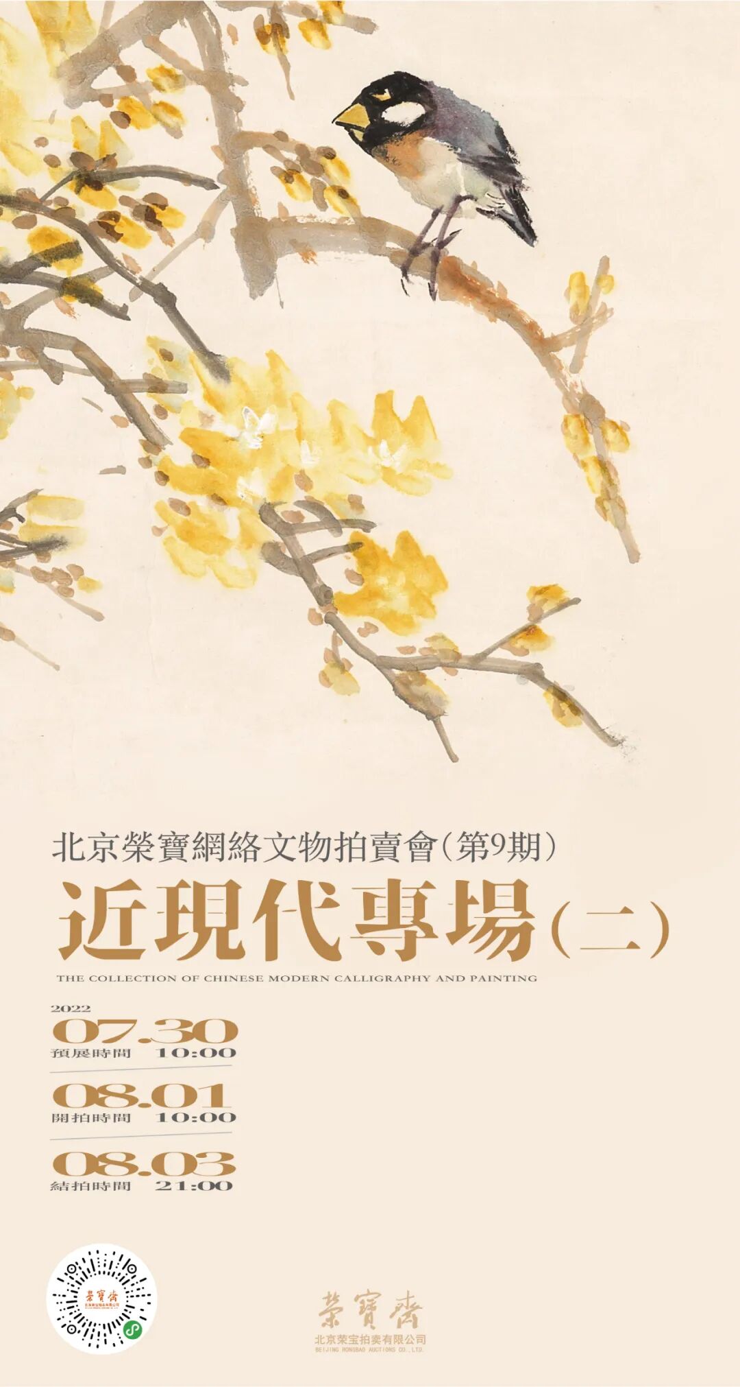 北京荣宝网络文物拍卖会(第9期)·近现代专场(二)将于7月30日10:00-8月1日10:00开启线上预展,并于8月1日10:00开拍,8月3日21:00结拍。