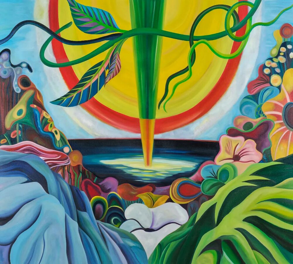 画中的不同元素犹如亚马逊热带雨林的炙热图腾,有机、灵动而肃穆;其构成的曲线则优美洒脱,充满女性艺术家之独有特质,同时弥漫着离奇怪异的神秘学氛围。每幅作品均呈现独特的对比张力,刚柔并济,明亮饱和的色彩此起彼伏,却悄悄藏着艺术家与大自然连结下最纯朴、最诚实的对话。