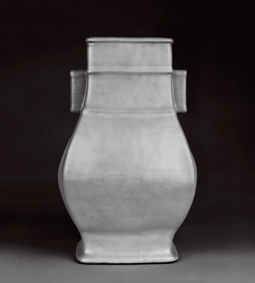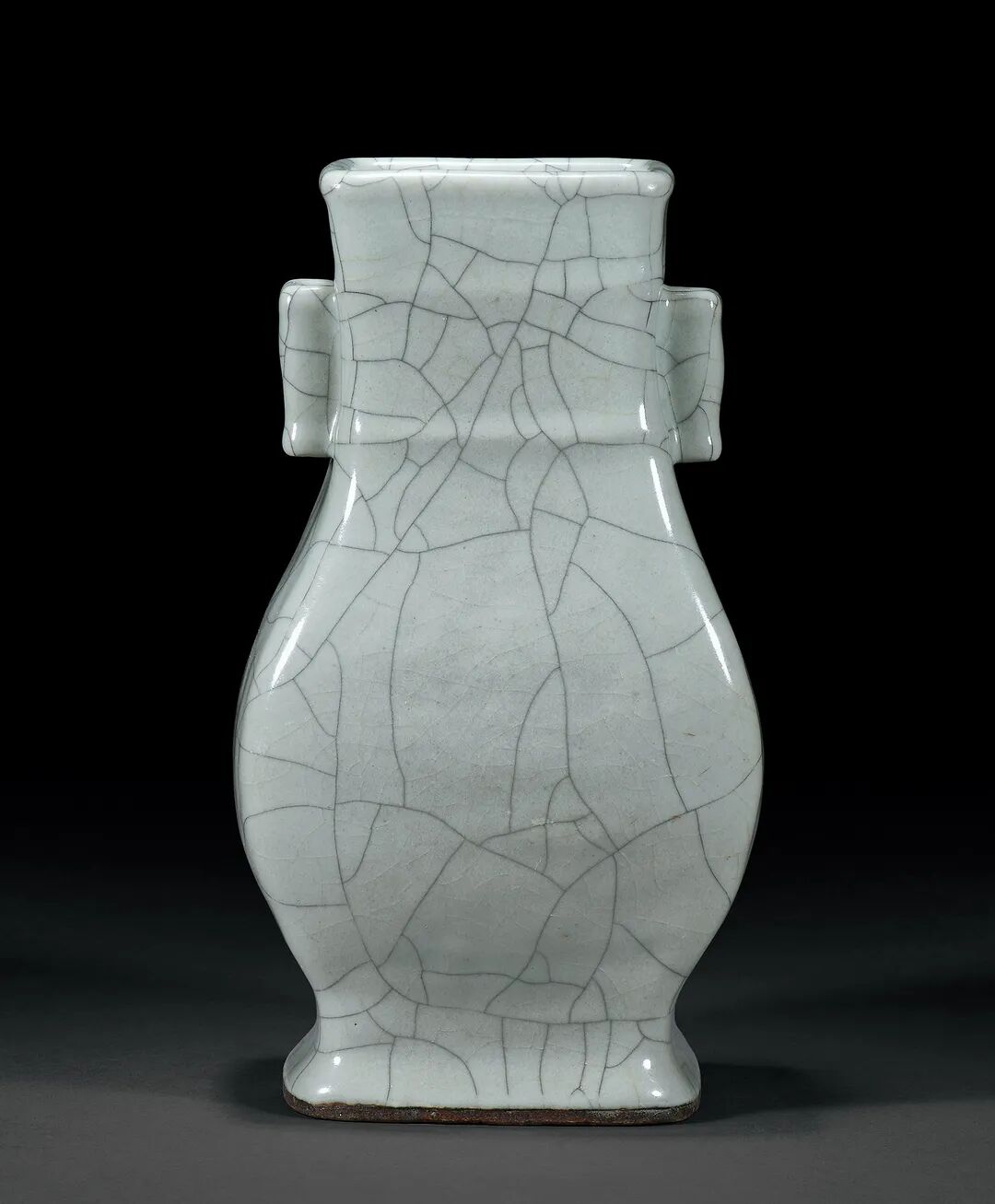 此器形源于青铜方壶,宋代即已流行,也是清代仿古瓷器的经典品种,雍乾两朝均有烧造,《乾隆二年分选存二色琢元瓷器及估价黄册》记载二色琢器第一桶中有哥釉收小一号四方双管瓶一件,应为拍品同类器物。