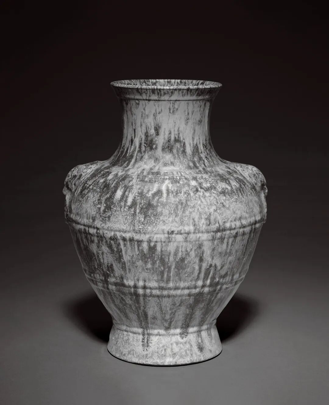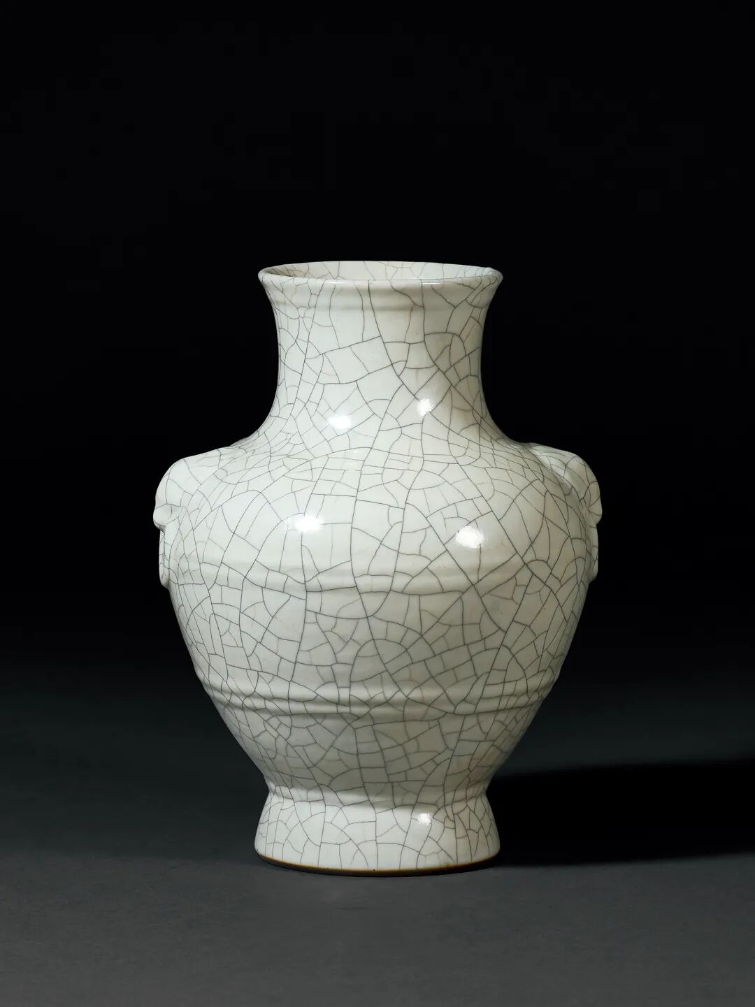 拍品与故宫博物院藏清雍正炉钧釉兽面衔环弦纹壶器形相同,此一造型另有茶叶末釉、窑变釉制品。其形源自商周青铜罍而略有损益,撇口束颈,肩部丰腴,两侧对称置铺首耳,腹下渐收,通体以弦纹装饰,下承圈足。施仿哥釉,釉面光润,金丝铁线开片自然分布,圈足底端施酱釉,以模拟“铁足”之态。