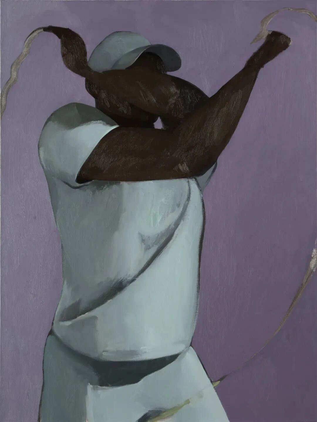 近两年的创作,李琪更多的把重心放在画面的律动感的表现上。主体物的造型,画面的构图,颜色分布的比例都是画面律动感的决定因素。《甩面1》的灵感源自海底捞的拉面小哥,他在食客面前自信地甩着长长的面条,身体似乎受到面条的牵引,格外柔软,但他的手臂肌肉却是在用力的控制着手中的这根面条。李琪被这种柔软却又很有力量感的曲线所吸引,这种曲线与跳跃的面条形成强烈的律动感。李琪期望能将这种强烈的律动感变现在画布这个二维空间上。