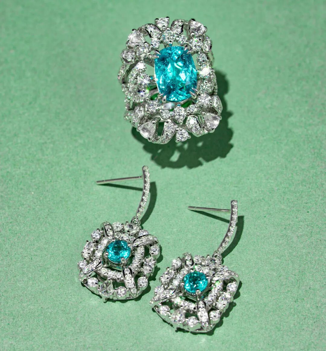 巴西帕拉依巴碧玺配钻石戒指及耳环套装
