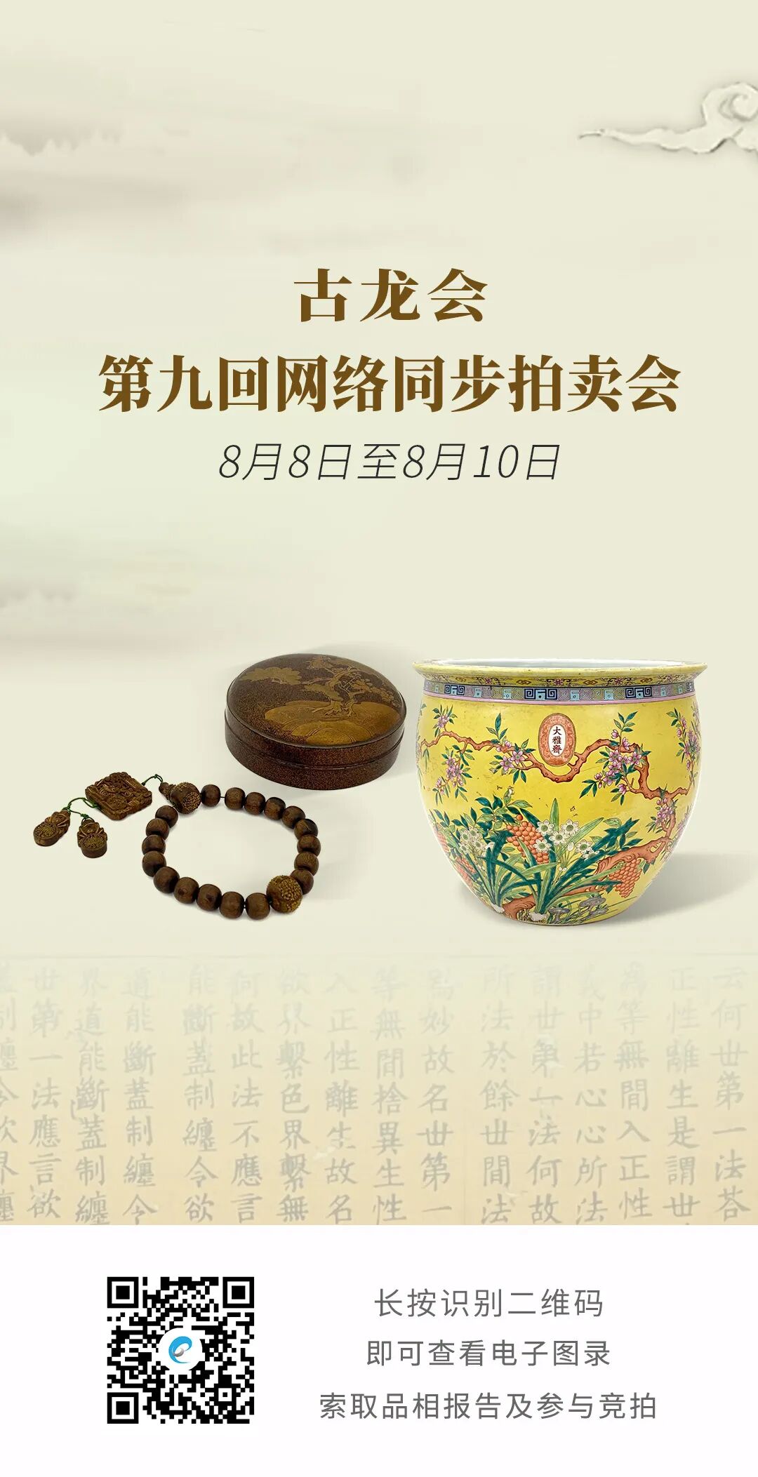 古龙会『第九回网络同步拍卖会』将于8月8日至10日期间举行,每日上午9点举槌,联拍在线将全程直播,并提供实时同步竞拍技术和服务支持。700余件古董艺术品涉及瓷器、漆器、玉石器、金属器、鼻烟壶、竹雕木刻、宗教艺术、传统书画、文房清玩等门类,各有佳例出现。拍品依旧走品质生货路线,主要征集自日本民间藏家。古龙会社长大谷宽先生挑选了部分心头之好,与大家进行分享: