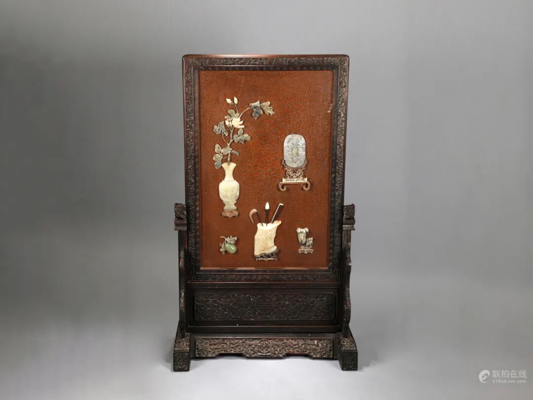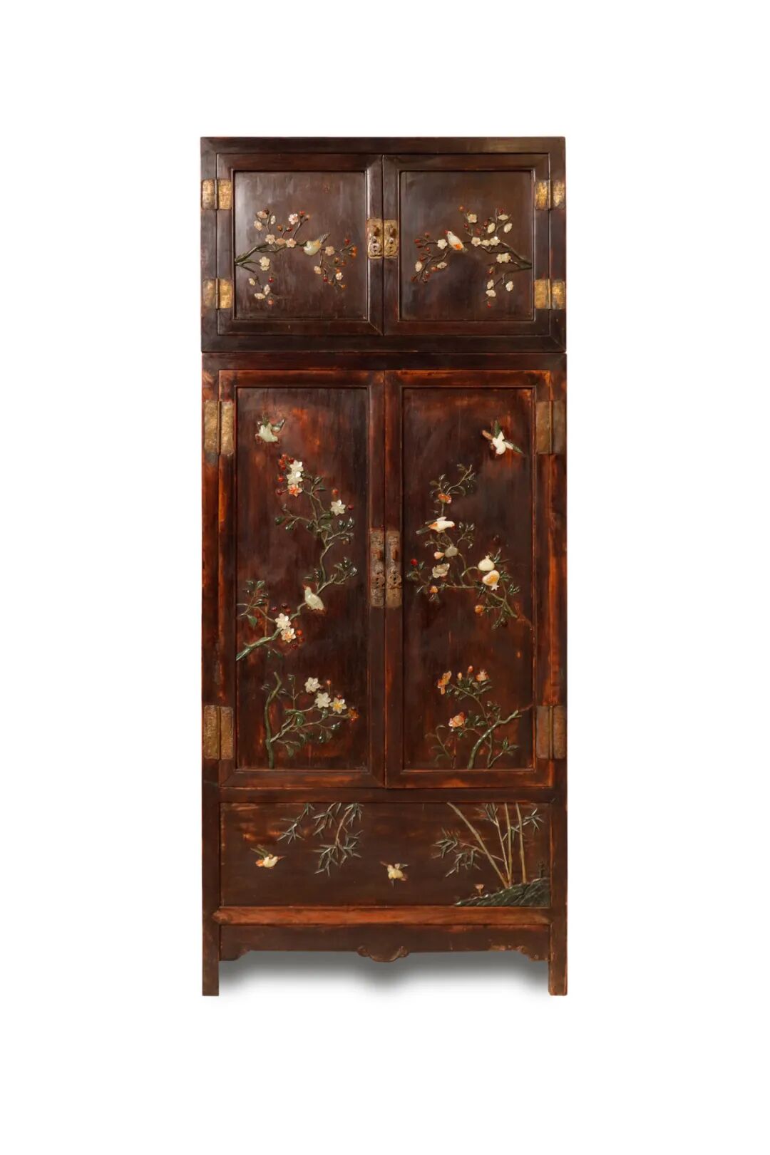 此件清代紫檀镶百宝玉顶箱柜为明清之紫黄家具之经典制式。顶箱柜之形则适逢其长,变成了形态端庄、制式优美,柜面上镶以和田白玉及红绿玛瑙精心制成的花鸟,构成一幅优美画卷。加上紫檀木材坚重、不易变形,因此顶箱柜成为清代紫檀家具最具代表性和欣赏价值的品种。但因它制作难度高、耗费材料多,造价高昂,产量有限,加上难以移动和存放,所以留存至今的数量较少,完好者更为稀见。进入清朝乾隆以后,为了尽显大清帝国的富裕奢华,利用紫檀木的可塑天性精凋细刻,造办处集中全国手艺高超的广州、苏州等地工匠,制作了一批艺术水准极高的紫檀雕饰家具。